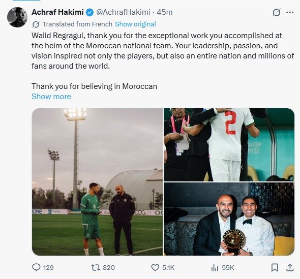 Dans une publication sur ses réseaux sociaux, le latéral droit du Paris Saint-Germain a adressé un message empreint de gratitude et de respect à son ancien entraîneur. « Walid Regragui, merci pour le travail exceptionnel que vous avez accompli à la tête de l’équipe nationale marocaine. Votre leadership, votre passion et votre vision ont inspiré non seulement les joueurs, mais aussi toute une nation et des millions de fans à travers le monde. Merci d’avoir cru au talent marocain, d’avoir renforcé l’esprit d’équipe et d’avoir montré qu’avec de la discipline, du travail et surtout avec la niya, on peut accomplir de grandes choses. Vous avez laissé une empreinte indélébile dans l’histoire du football marocain. Merci de nous avoir fait rêver et d’avoir porté nos couleurs avec tant de fierté. Légende ❤️🇲🇦 »