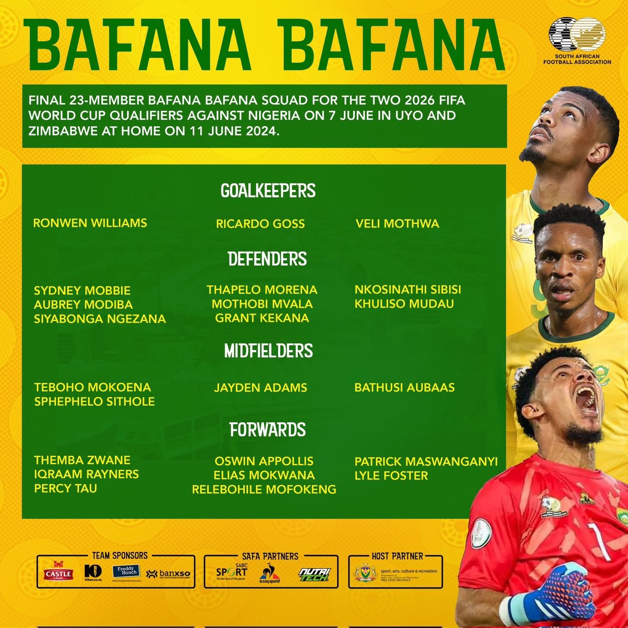 Hugo Broos a publié la liste officielle des joueurs retenus pour la reprise des éliminatoires du mondial 2026 en juin 2024. Les Bafana Bafana disputeront deux matchs contre le Nigeria et le Zimbawe dans le cadre des 3ᵉ et 4ᵉ journées des éliminatoires du tournoi mondial de 2026. Le sélectionneur de l’équipe nationale d’Afrique du Sud a dévoilé une liste sans grande surprise pour ces rendez-vous.