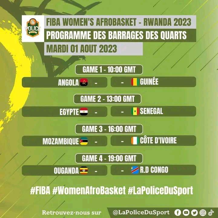 Le mardi 1er août 2023, les barrages des quarts de finale se dérouleront avec des matchs captivants. Les quatre rencontres promettent du suspense et de l’intensité sur le parquet. L’Angola affrontera la Guinée à 10h, suivi du choc entre l’Égypte et le Sénégal à 13h. Ensuite, le Mozambique sera opposé à la Côte d’Ivoire à 16h, tandis que l’Ouganda et la RDC clôtureront la journée à 19h.