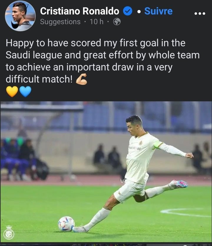 Dans un message publié sur les réseaux sociaux, CR7 a indiqué en anglais : « Heureux d’avoir marqué mon premier but dans le championnat saoudien et grand effort de toute l’équipe pour obtenir un important match nul dans un match très difficile ! »