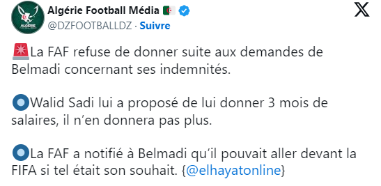 Selon des sources locales, suite à une réunion houleuse et des échanges de lettres, la FAF a officiellement notifié à Belmadi qu’il n’était plus à la tête de la sélection nationale, lui proposant trois mois de salaire en compensation pour la résiliation de son contrat. En réponse, Belmadi a exigé une réévaluation de cette proposition ou le paiement intégral de ses salaires jusqu’en décembre 2026, donnant un ultimatum de huit jours à la FAF.