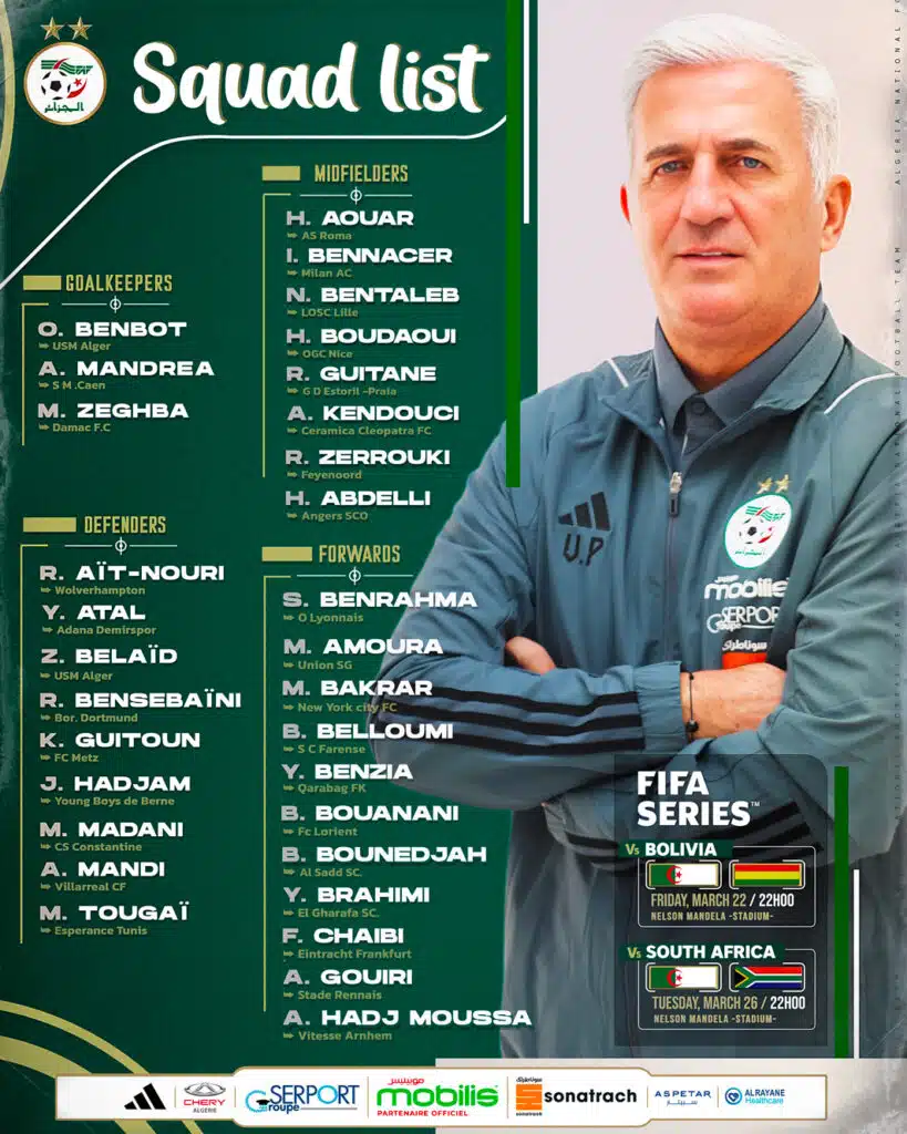 Vladimir Petkovic, récemment nommé sélectionneur de l’Algérie, a dévoilé ce vendredi 15 mars 2024 sa première liste. Il a sélectionné 31 joueurs pour le tournoi FIFA Series de mars 2024. L’Algérie va affronter la Bolivie (vendredi 22 mars) et l’Afrique du Sud (mardi 26 mars) lors de cet évènement.