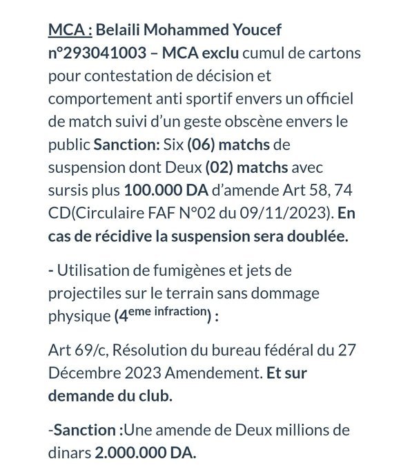Suite à ces incidents, la Ligue de Football Professionnel (LFP) a infligé à Belaili une lourde sanction : six matchs de suspension, dont deux avec sursis, ainsi qu’une amende de 100 000 DA. Malgré les contestations et les recours possibles, cette décision risque de l’éloigner des terrains pour un certain temps.