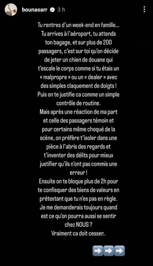 « Tu arrives à l’aéroport, tu attends ton bagage, et sur plus de 200 passagers, c’est sur toi qu’on décide de jeter un chien de douane qui t’escalade le corps comme si tu étais un «malpropre » ou un « dealer » avec des simples claquement de doigts! Puis on te justifie ça comme un simple contrôle de routine. », a-t-il écrit.