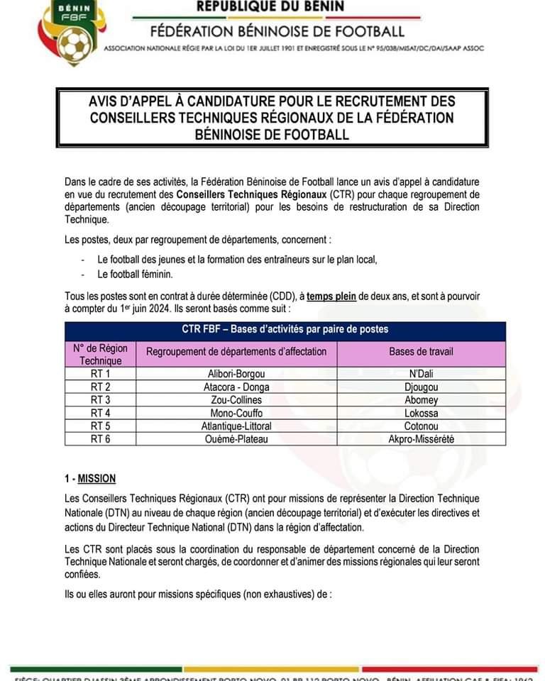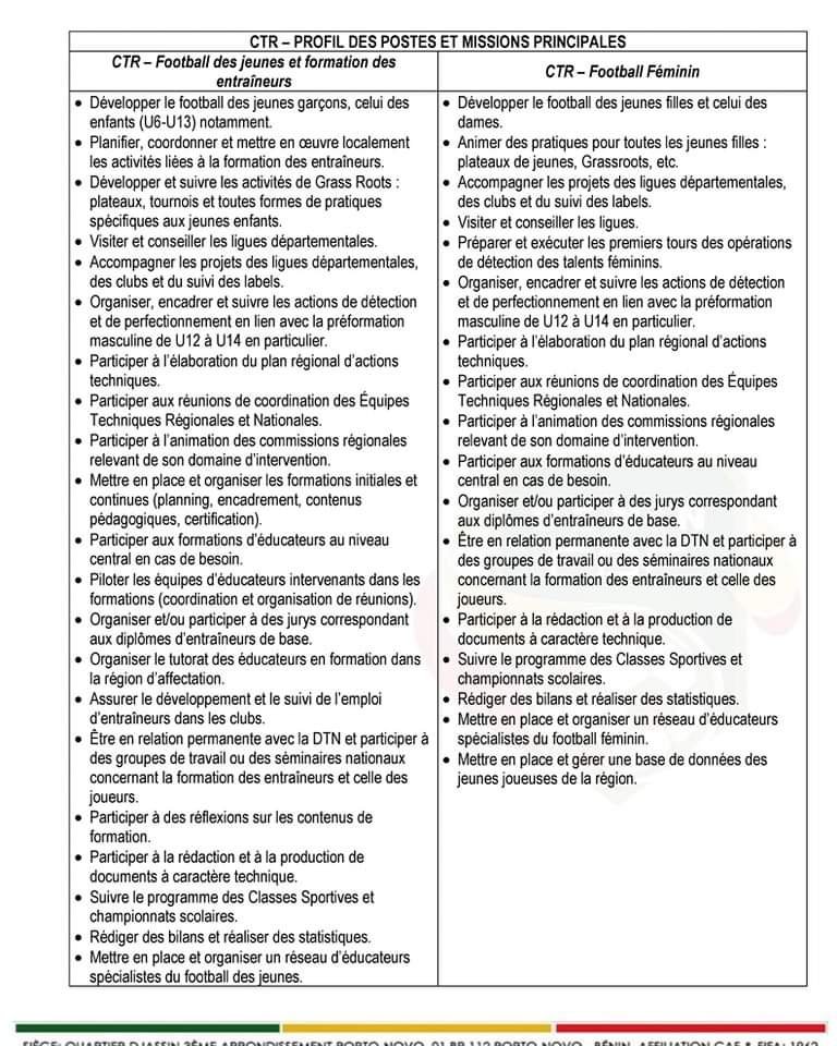 La FBF lance également un appel à candidatures pour le recrutement de deux Conseillers Techniques Régionaux par regroupement de départements. Ces postes impliquent la supervision du football des jeunes, la formation des entraîneurs locaux et le développement du football féminin. Les détails de l’offre ci-dessous !