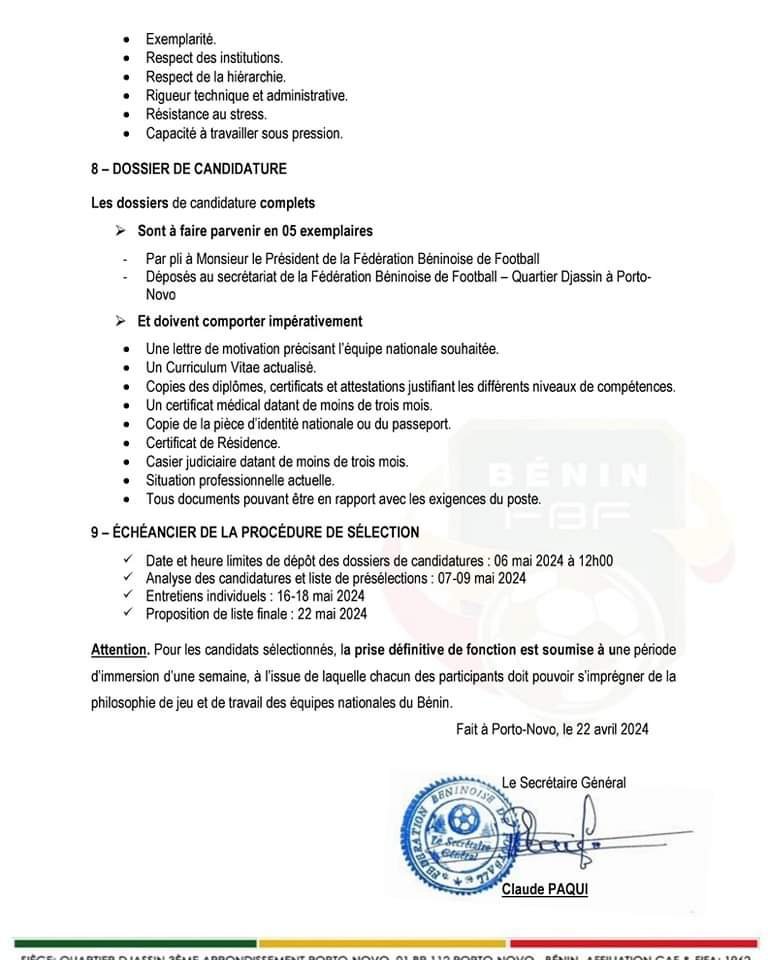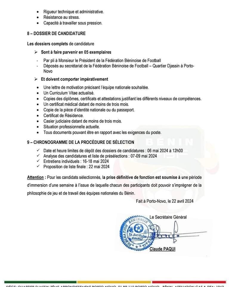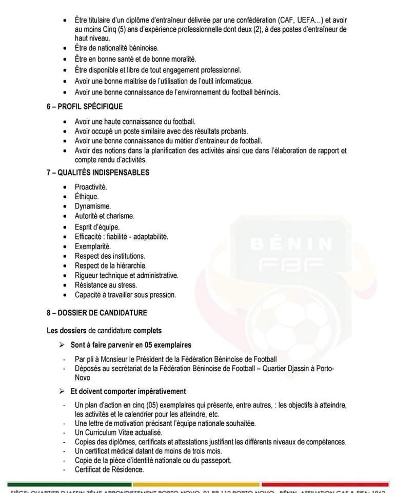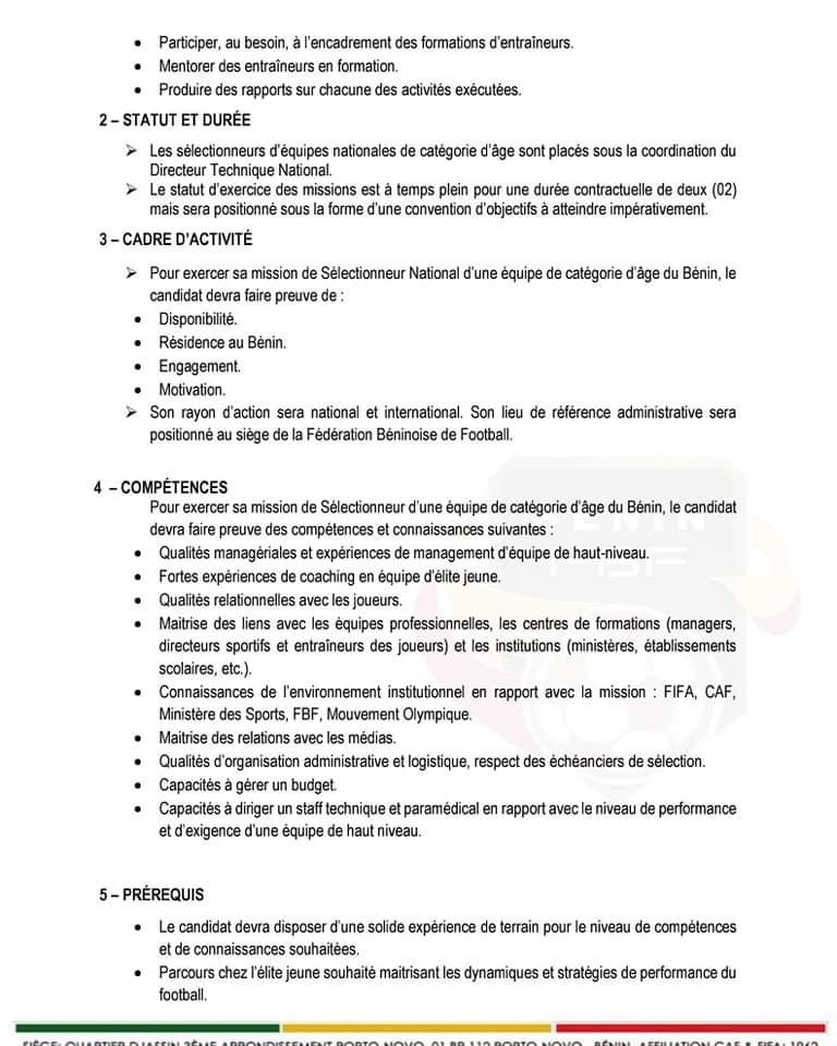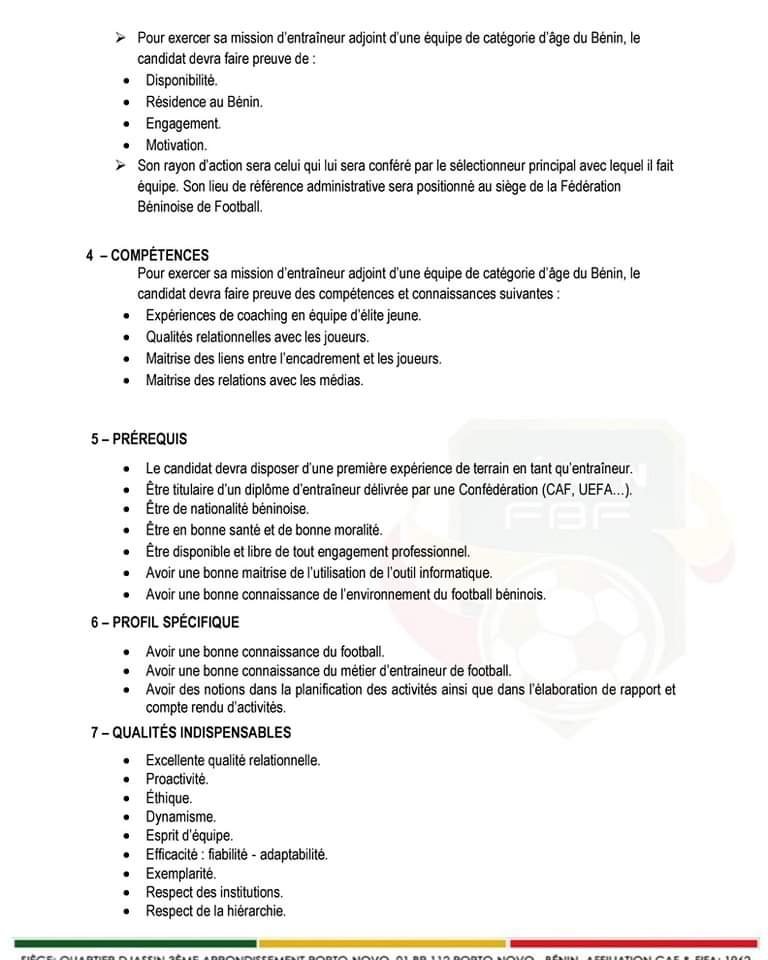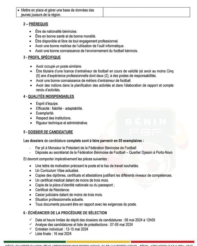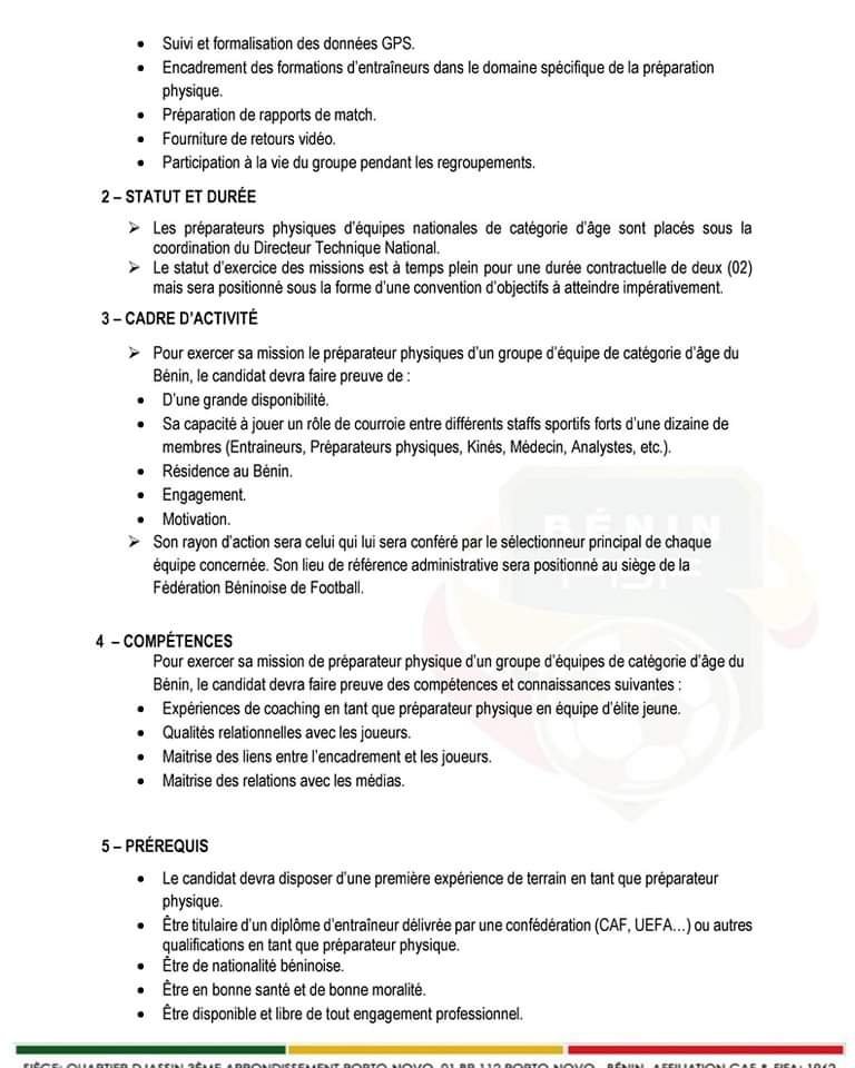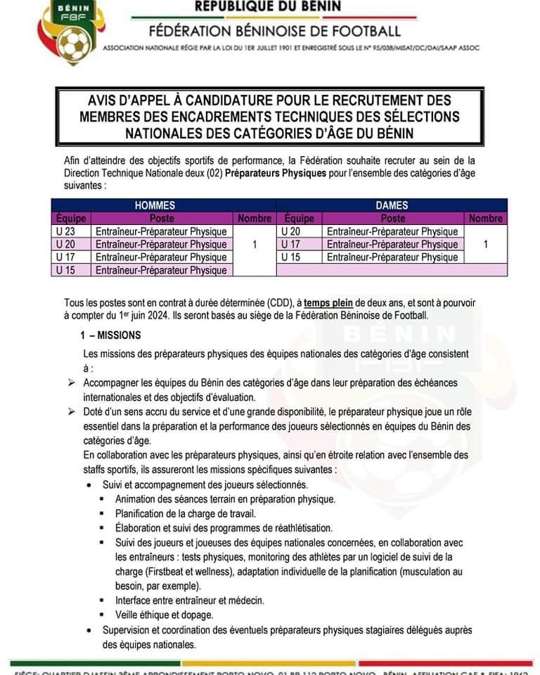 La Fédération Béninoise de Football recherche deux (02) Préparateurs Physiques pour l’ensemble des sélections de catégories d’âge du Bénin à savoir: U15, U17, U20 et U23 chez les garçons et U15, U17, et U20 chez les filles. Les candidats doivent avoir des compétences en conditionnement physique et en préparation athlétique.