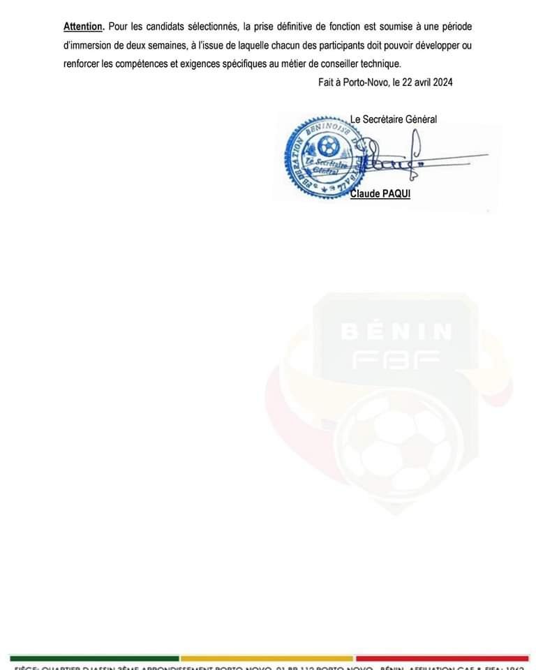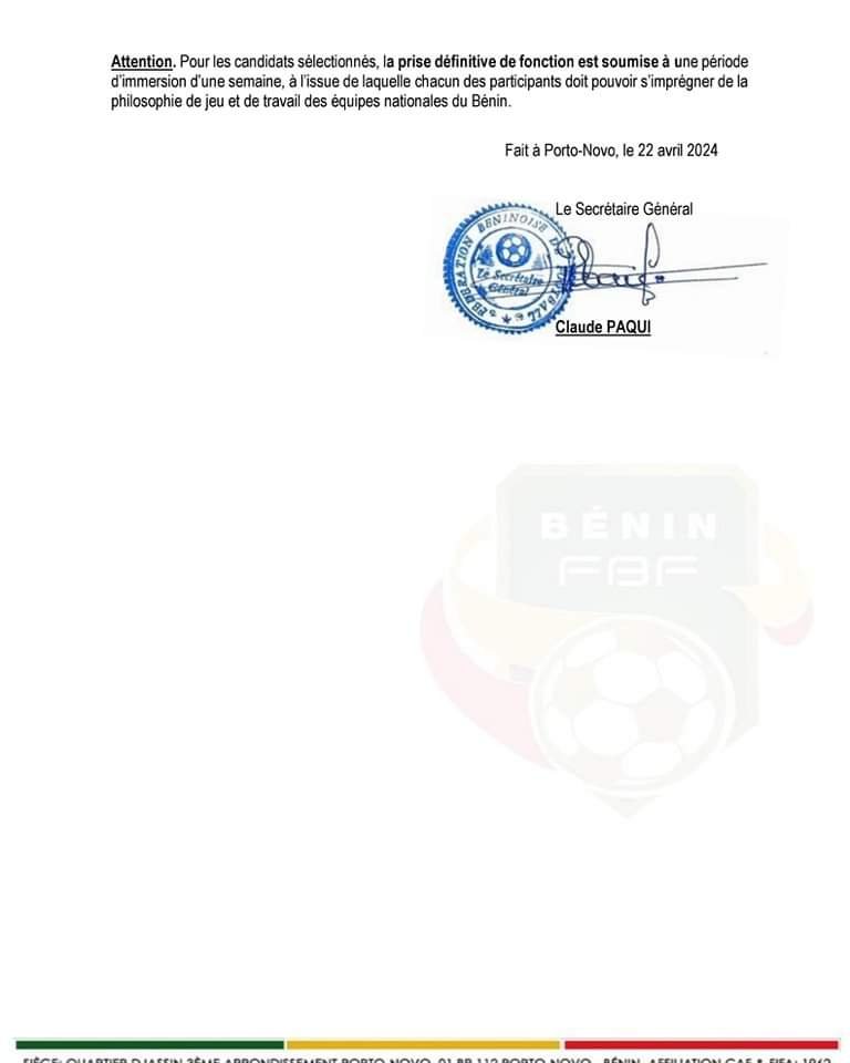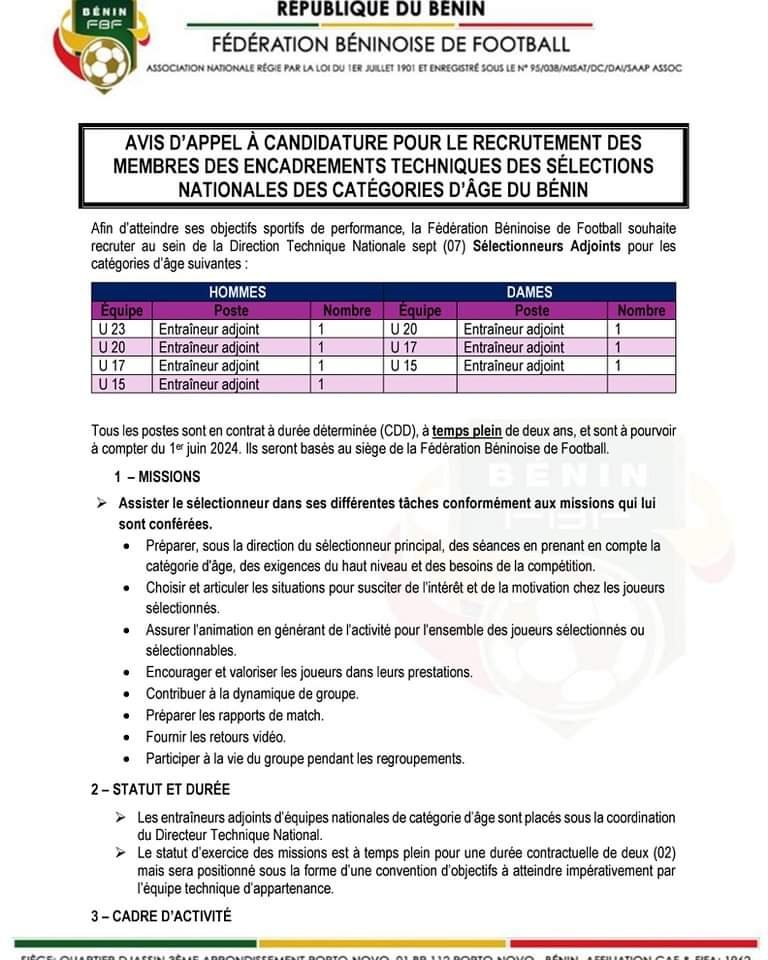 La Fédération Béninoise de Football (FBF) lance un vaste appel à candidatures pour pourvoir plusieurs postes au sein de ses équipes nationales de différentes catégories d’âge ainsi que des postes techniques régionaux. En effet, ces offres de recrutements concernent les sélectionneurs adjoints et nationaux, les préparateurs physiques, les entraîneurs de gardien(ne) de but, des Conseillers Techniques Régionaux (CTR). Voici les détails de ces offres d’emploi.