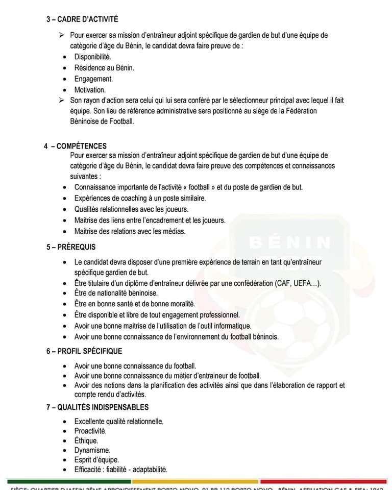 Sept postes d’entraîneurs de gardien(ne) de but sont à pourvoir pour les équipes de jeunes du Bénin à savoir : U15, U17, U20 et U23 chez les garçons et U15, U17, et U20 chez les filles. Les candidats doivent avoir une expertise dans le développement des compétences spécifiques des gardiens de but. pour l’ensemble des sélections de catégories d’âge du Bénin. Voici les détails de l’offre !