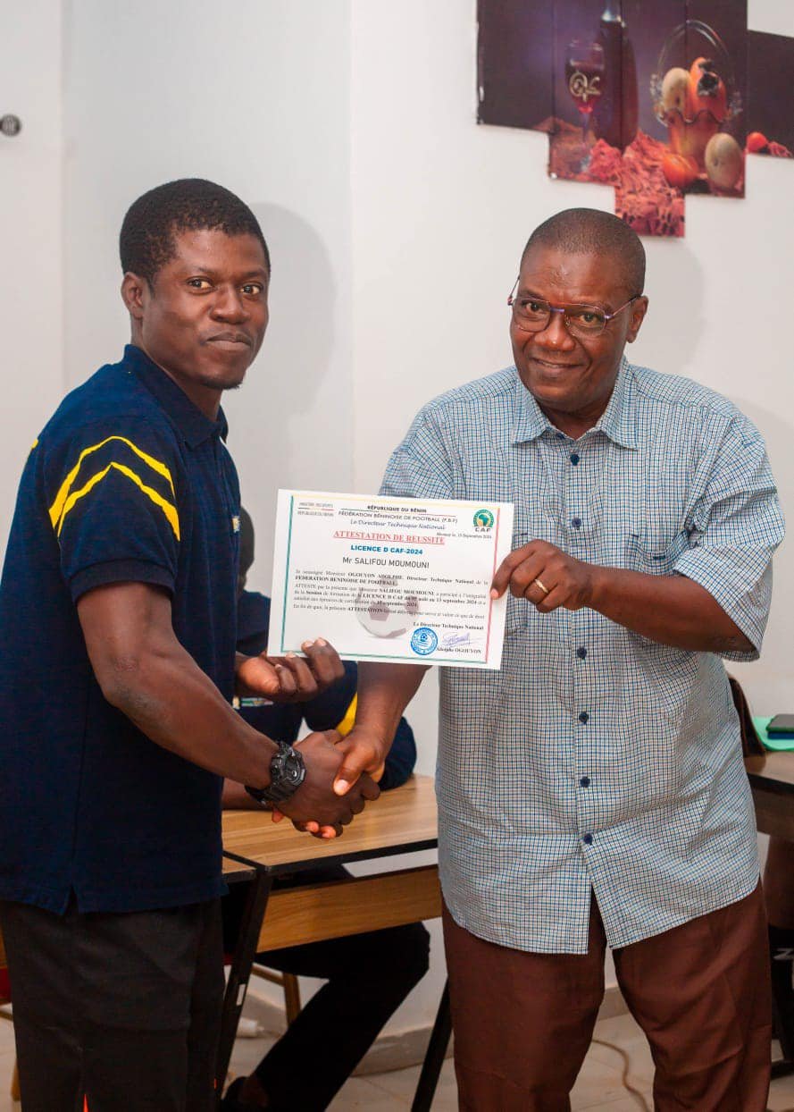 Le samedi 14 septembre 2024 à Abomey, une trentaine d’encadrants issus de centres de formation sportive ont reçu leur certification de la Licence D/CAF. Cette initiative, fruit d’une collaboration entre le Ministère des Sports et la Fédération Béninoise de Football (FBF), s’inscrit dans le cadre d’un programme visant à renforcer les compétences des formateurs locaux. La formation, qui s’est déroulée du 09 au 15 septembre 2024, a été assurée par la Direction Technique Nationale de la FBF. Son objectif principal était d’améliorer la capacité des encadrants à détecter et à préparer les jeunes talents sportifs au Bénin, contribuant ainsi à l’évolution du football à la base.