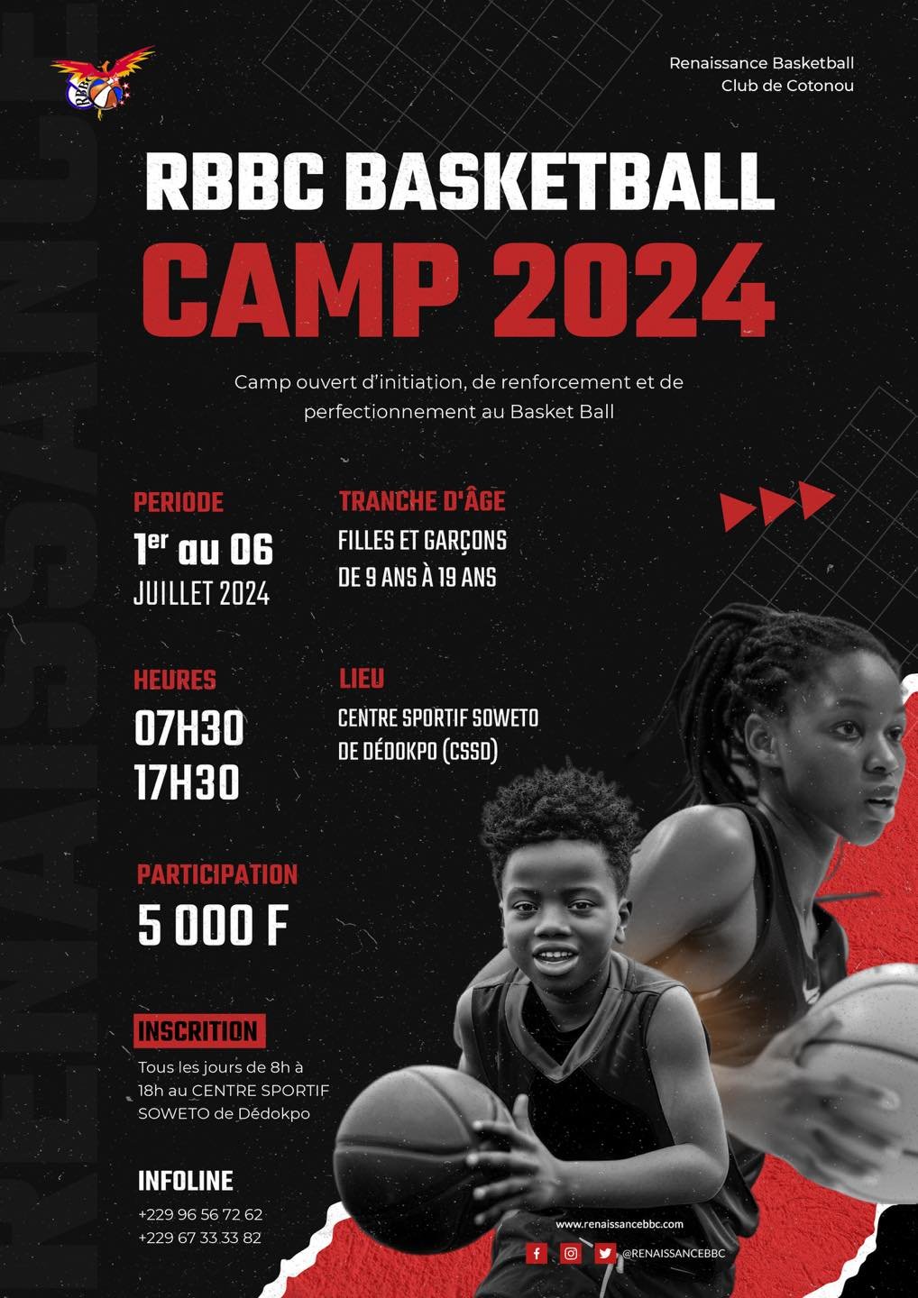 Comme à l’accoutumée, le Club de basketball Renaissance de Cotonou organise l’édition 2024 de son camp. Un camp d’initiation, de renforcement et de perfectionnement au basketball. Cet événement se tiendra du 1ᵉʳ au 6 juillet 2024, de 7 h 30 à 17 h 30, au Centre Sportif Soweto de Dédokpo.