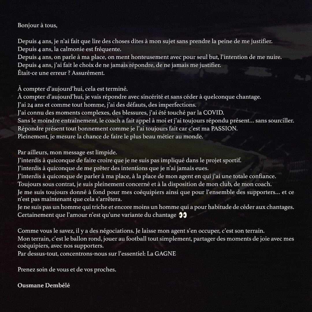 Ci dessous en image le message de Ousmane Dembélé sur Instagram