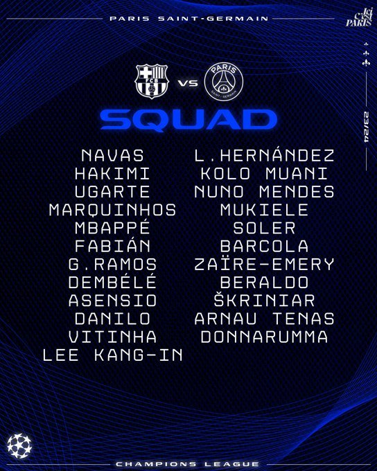 Le PSG se déplace à Montjuïc pour défier le Barça, ce mardi 16 avril 2024, en ¼ de finale retour de Ligue des champions de l’UEFA. En prélude à ce choc, l’entraîneur de la formation, Luis Enrique, a déjà dévoilé la liste officielle des joueurs retenus pour tenter de remonter le score. La bonne nouvelle est le retour de Achraf Hakimi et de Nordi Mukiele qui ont manqué la manche aller des quarts de finale, mais qui seront du déplacement à Barcelone.