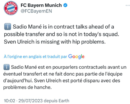 Dans une publication sur la toile, le Bayern Munich a annoncé être ouvert à la possibilité de vendre Mané cet été, et cela aurait influencé la décision de l’écarter du groupe pour la préparation de la nouvelle saison. Bien que le club n’ait pas encore officialisé le départ de l’attaquant sénégalais, cette exclusion du groupe laisse entendre que les négociations pourraient être en cours.
