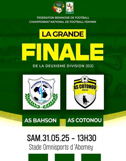 Le football féminin béninois sera à l’honneur ce samedi 31 mai 2025 au Stade Omnisports d’Abomey, avec la grande finale tant attendue du championnat de Deuxième Division (D2). À 13h30, AS BAHSON affrontera AS COTONOU dans une rencontre décisive pour le titre de championne de D2.