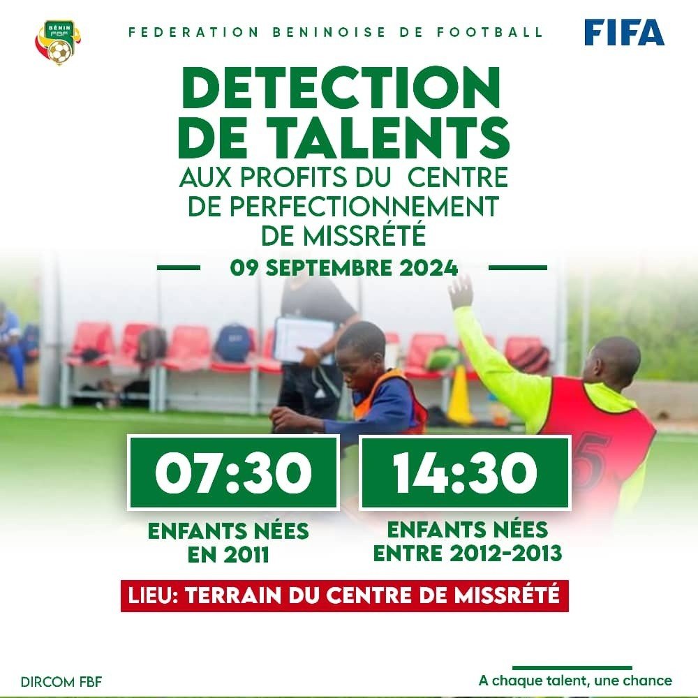 La Fédération Béninoise de Football (FBF) a récemment annoncé une détection de jeunes talents au profit du Centre de Perfectionnement de Missérété. C’est une session complémentaire qui fait suite aux nombreuses demandes de jeunes talents qui n’ont pas pu participer à la première phase de détection. La détection est prévue pour le 09 septembre 2024 et s’adresse aux enfants nés en 2011, 2012, et 2013.
