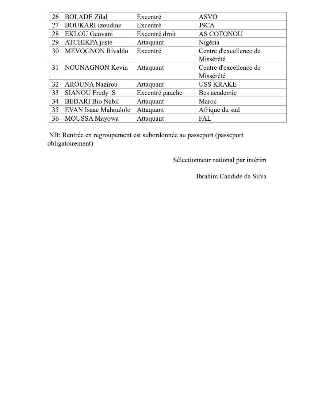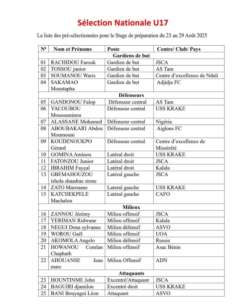 Le sélectionneur national par intérim des Guépards U17 a dévoilé une liste de 36 joueurs pré-sélectionnés en vue des qualifications UFOA-B U17 2025. Ce stage préparatoire se déroulera du 24 au 29 août 2025 au centre d’excellence de Missérété. Après un premier regroupement organisé en juillet, ce second stage vise à affiner les automatismes de l’équipe en prévision du tournoi qualificatif. Les joueurs convoqués sont attendus le dimanche 24 août à 10h au centre d’excellence de Missérété, à Cotonou.