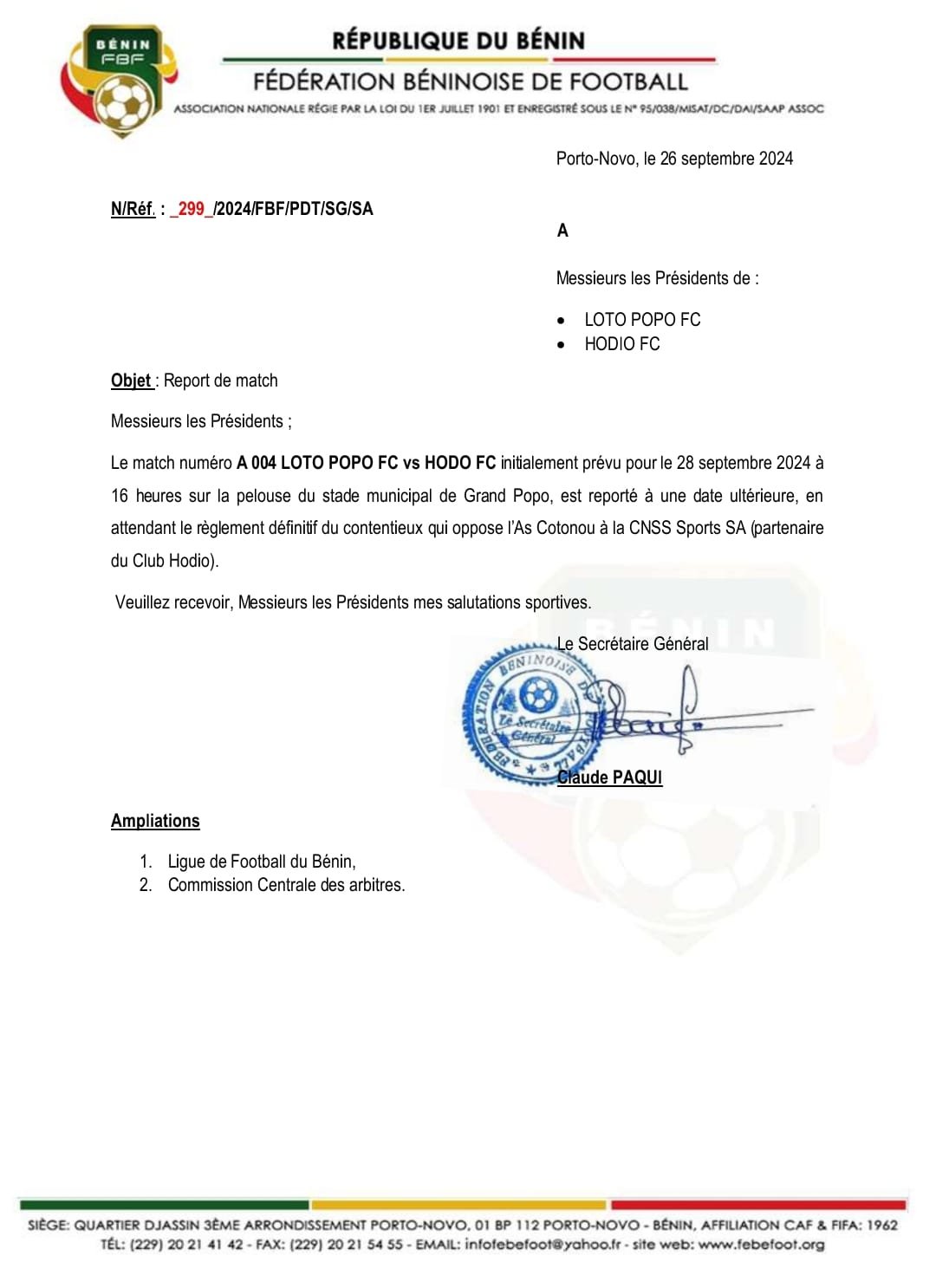 En remplacement, le match à suivre sera Aspac FC vs Sobemap, diffusé sur A+ Bénin ce samedi. Par ailleurs, pour combler ce report, Loto Popo FC a prévu un match amical contre JSGP (Jeunesse Sportive de Grand-Popo) à 16h au Stade Omnisport de Grand-Popo.