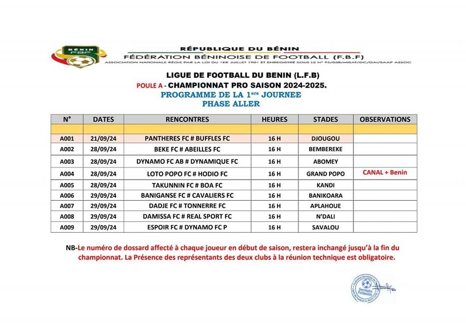 La saison 2024-2025 du championnat de football professionnel du Bénin continue ce samedi 28 septembre 2024, avec plusieurs rencontres prévues. Cependant, un changement de programme a été annoncé par la Fédération Béninoise de Football. Le match Loto Popo FC vs Hodio FC a été reporté à une date ultérieure.
