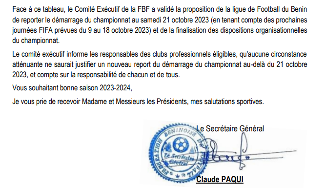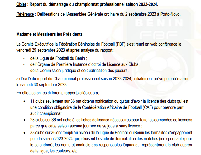 Bénin : Le démarrage du Championnat Professionnel reporté, note circulaire officielle