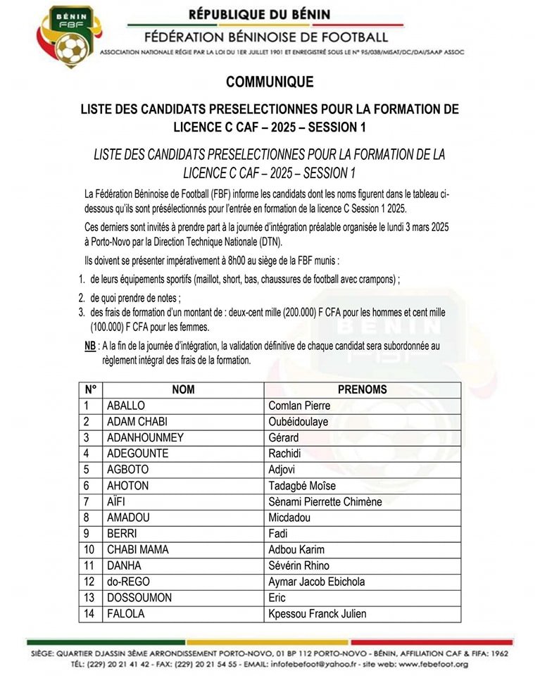 La Fédération Béninoise de Football (FBF) a dévoilé, ce vendredi 28 février 2025, la liste des candidats présélectionnés pour la formation de la Licence C CAF – Session 1 (2025). Cette formation, qui vise à renforcer les compétences des entraîneurs, se déroulera selon un cadre bien défini avec des conditions spécifiques.
