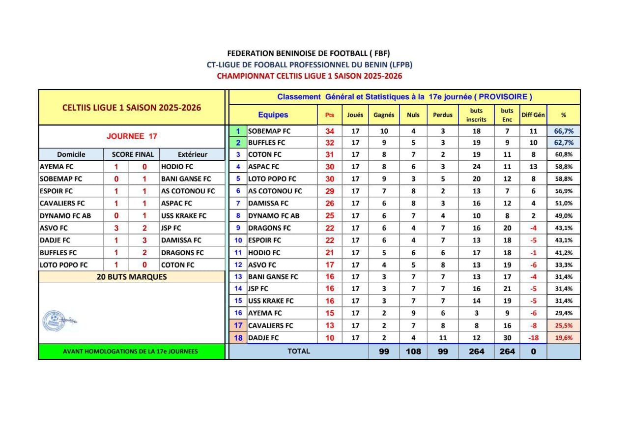 La phase aller de la Celtiis Ligue Pro 2025-2026 a officiellement pris fin au Bénin à l’issue des rencontres de la 17ᵉ journée, disputées les samedi 7 et dimanche 8 février 2026. Ce dernier acte de la première moitié de saison a confirmé les tendances du championnat, aussi bien en tête qu’en bas de tableau.