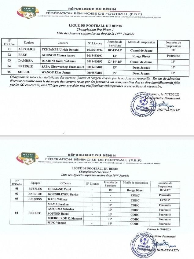 Débuté depuis plusieurs semaines, le championnat professionnel de football du Bénin, saison 2022-2023, se poursuit. La Ligue Pro du Bénin a déjà fermé 15 journées. Juste avant les rencontres de la 16ème journée, la fédération béninoise de football a rendu public une liste de joueurs et dirigeants suspendus pour cette nouvelle journée.