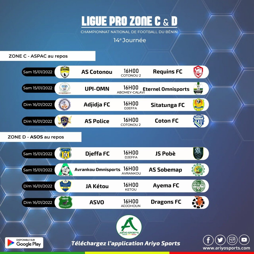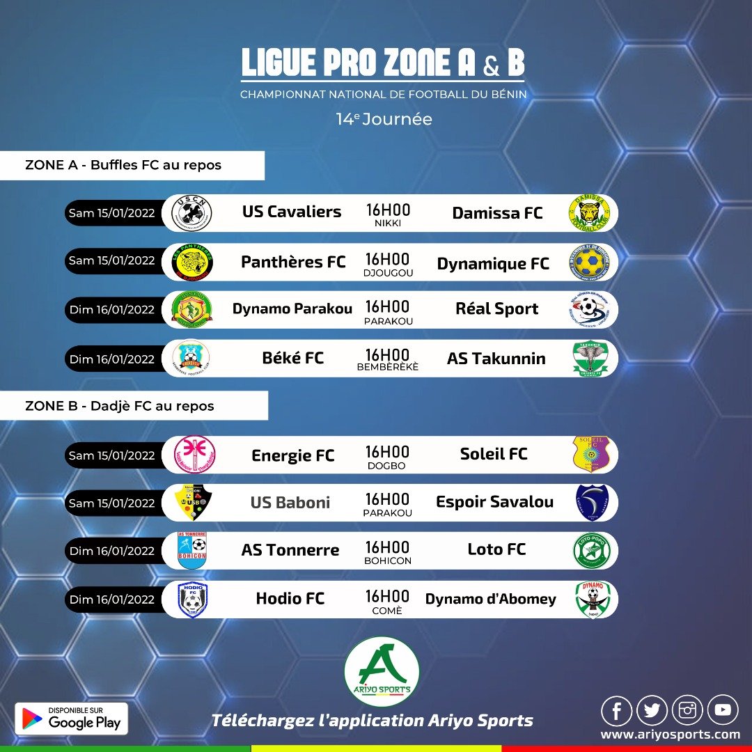 L’acte 14 de la ligue professionnelle de football du Bénin sera disputé ce weekend du 15 au 16 janvier 2022. D’importants matchs sont à vivre sur nos différents stades, dans les différentes zones.