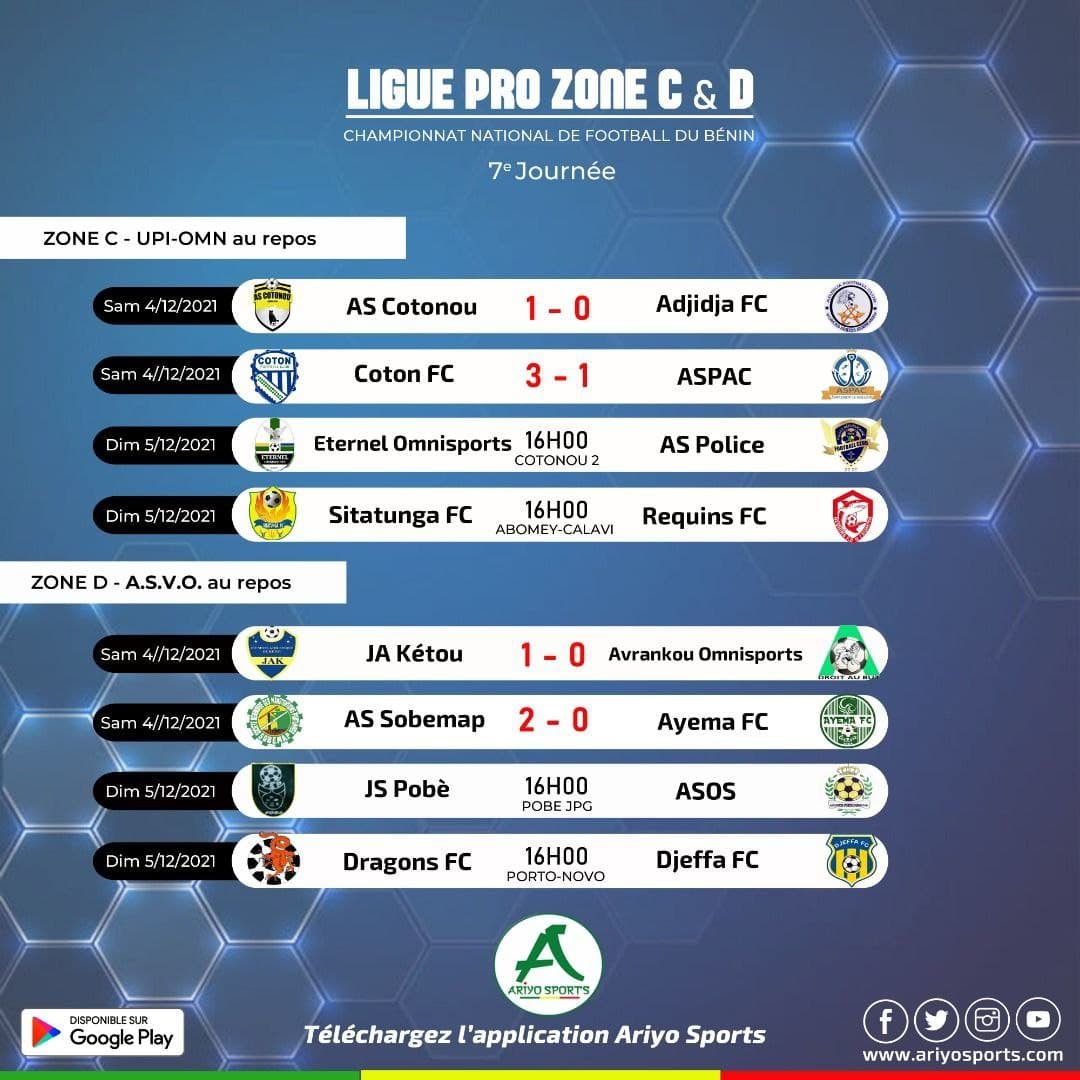Dans la zone C, Coton FC reste intraitable. L’équipe de Ouidah a dominé les Portuaires de l’ASPAC, et garde plus que jamais la tête du classement de la zone. L’AS Cotonou renoue avec la victoire en s’imposant devant les militaires d’Adjidja.