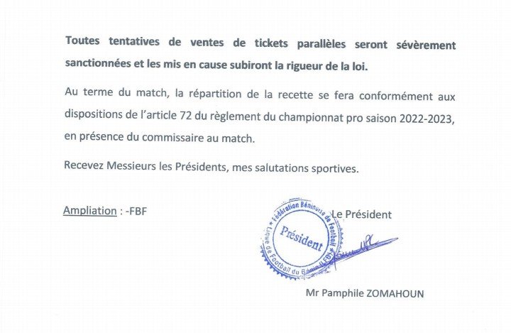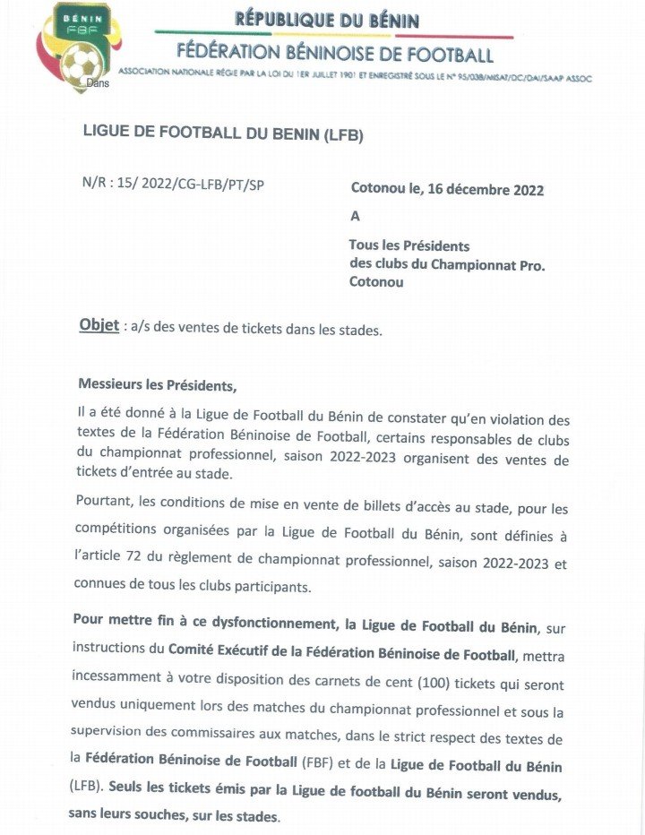 Dans une lettre adressée aux présidents des clubs du championnat professionnel de football du Benin, la fédération béninoise de football a fait une mise au point sur la question de vente des tickets pour les matchs du championnat local. L’instance dirigeante du football beninois condamne les ventes illégales des tickets, et rappelle la stratégie qu’elle a adopté pour régler la situation de vente des tickets pour les matchs.