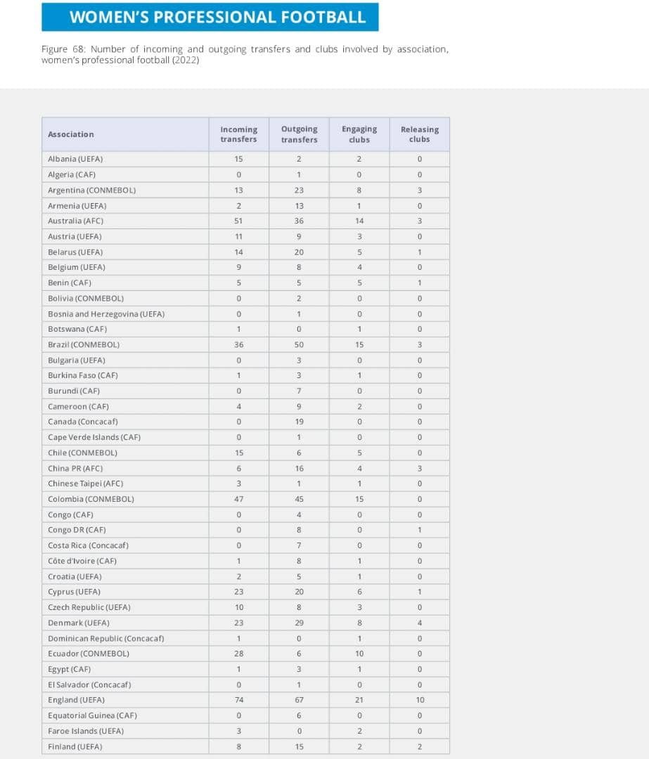 Ce jeudi 26 janvier 2023, la FIFA a publié son rapport sur le marché des transferts. D’après le rapport, le nombre de transferts dans le football professionnel masculin a accéléré. Mais il n’était pas seulement question du football masculin. Ce rapport mondial de la FIFA sur les transferts confirme par ailleurs l’essor continuel du football féminin. Sur les transferts opérés durant de l’année 2022 au Bénin, 5 clubs de football féminin du Bénin ont exporté 5 joueuses.