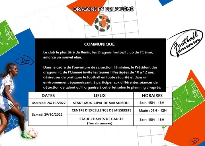 Le club des Dragons de l’Ouémé entre officiellement dans une nouvelle dimension. En effet, après avoir longtemps écrit l’histoire dans le championnat de football béninois avec sa catégorie d’homme, les Dragons de l’Ouémé vont tenter de se faire un nom au niveau des femmes. Ainsi, le club le plus titré du Benin chez les hommes, ouvrent officiellement une section féminine. Dans un communiqué, l’information a été révélée par le club même avec des détails sur les premières activités de cette nouvelle initiative.