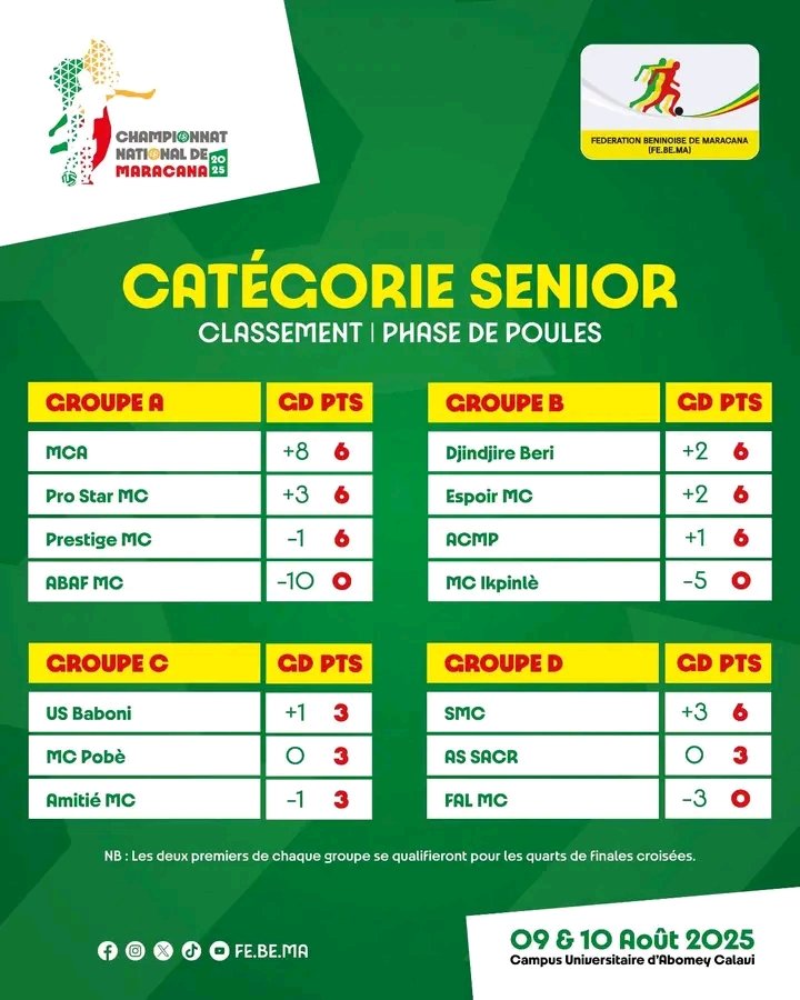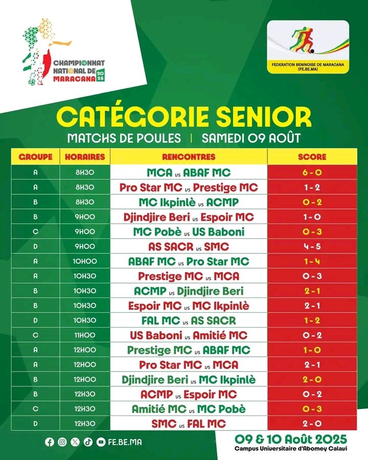 Pour cette phase nationale, 41 équipes, dont 5 formations féminines, issues de 26 clubs et représentant les 12 départements du pays, sont en lice. Les rencontres se déroulent sur deux jours, exclusivement sur le campus universitaire d’Abomey-Calavi. À la clé, un titre national mais aussi une opportunité unique : intégrer la sélection nationale pour la prochaine compétition africaine en Guinée-Bissau. Nassirou Saka a confié : « Cette phase nationale nous permet d’identifier les talents qui rejoindront nos sélections nationales pour préparer la Mara’Can Bissau 2025 (…) Nous ne pourrons bâtir un Maracana fort qu’en restant unis, rigoureux et engagés. »