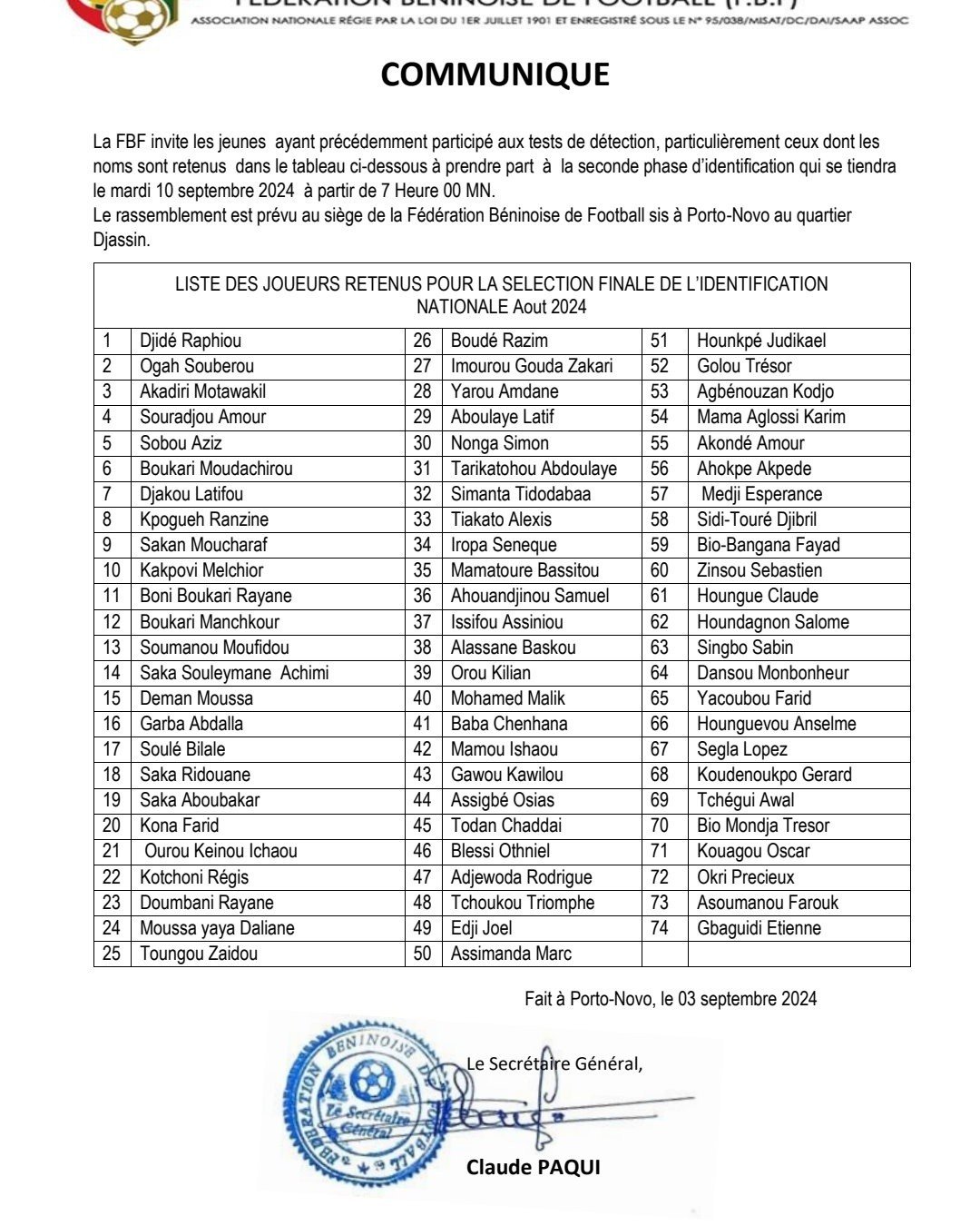 La détection aura lieu le mardi 10 septembre 2024 à partir de 7h00, et le lieu de rassemblement est fixé au siège de la Fédération Béninoise de Football, situé dans le quartier Djassin à Porto-Novo.