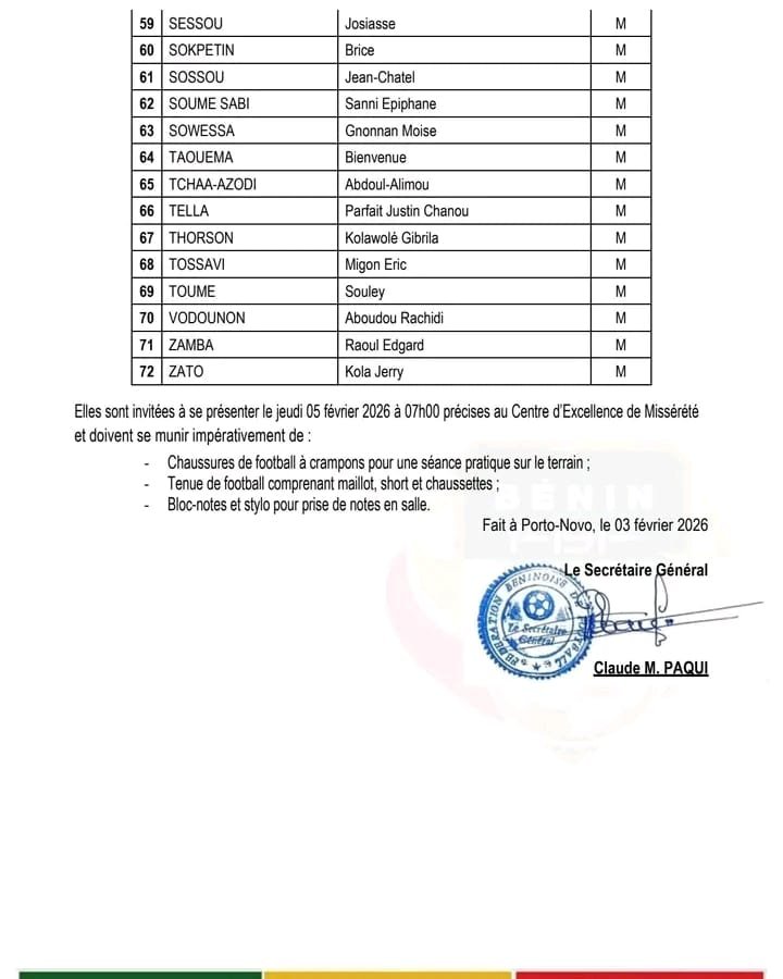 Dans un communiqué publié ce mardi 3 février 2026, la Fédération Béninoise de Football (FBF) a rendu publique la liste des candidats admis à participer aux tests d’entrée en formation pour l’obtention de la Licence CAF B. L’instance fédérale précise que les épreuves se dérouleront conformément aux dispositions organisationnelles arrêtées pour cette édition.
