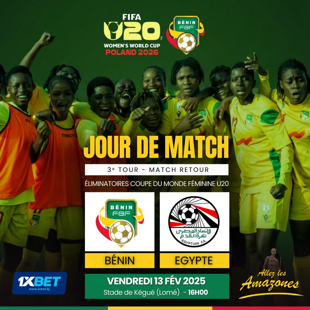 C’est jour de match pour les Amazones U20 du Bénin. Ce vendredi 13 février 2026, au stade de Kégué à Lomé (15h, 16h au Bénin), les jeunes internationales béninoises affrontent l’Égypte dans le cadre de la manche retour du troisième et avant-dernier tour des éliminatoires de la Coupe du Monde Féminine U20, Pologne 2026. Un rendez-vous capital dans la quête d’une qualification historique.