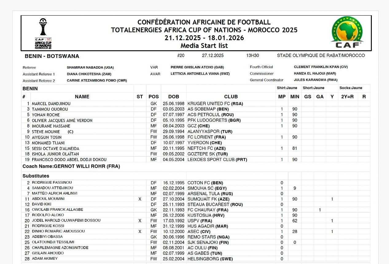 Le Bénin a rendez-vous face Botswana ce samedi 27 décembre 2025. Un duel à l’occasion de la deuxième journée de groupes de la CAN 2025. Après le test d’entrée contre la RDC, les Béninois, retrouvent leur effectif complet. Les cinq éléments majeurs qui étaient absents au premier match sont disponibles. Ainsi, le Bénin retrouve un Onze habituels. Gernot Rohr veut s’appuyer sur l’expérience et la jeunesse.