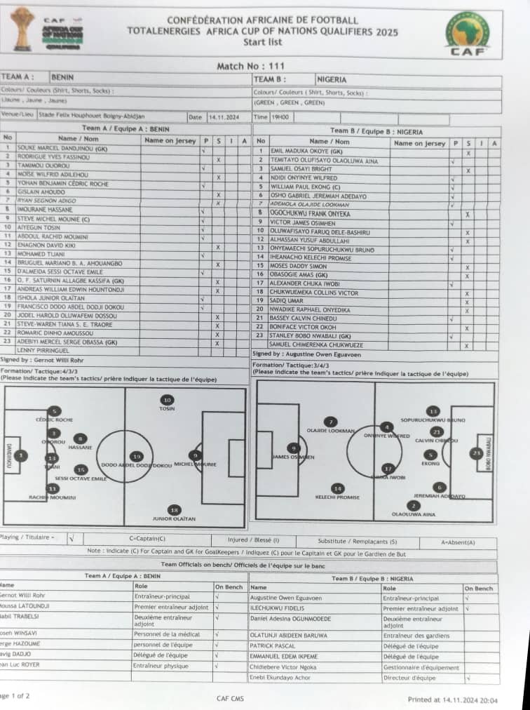 Le Bénin se mesure à nouveau au Nigeria ce jeudi 14 novembre 2024 à l’occasion de la 5ᵉ journée des éliminatoires CAN 2025. Les Guépards vont tenter de décrocher une nouvelle victoire dans la course à la qualification. Pour cette rencontre qui débute à 19H GMT, soit 20H de Cotonou, découvrez le classement concocté par le sélectionneur Gernot Rohr. Jodel Dossou, débute sur le banc en lieu et place de Tosin Aiyegun dans le classement habituel de Gernot Rohr. Andreas Hountondji débute aussi à la touche. Quant à Cédric Hountondji et Olivier Verdon, forfaits de dernière minute, il a été remplacé par Mohammed Tidjani et Yohan Roche dans l’axe. Tamimou Ouorou est aussi titulaire.
