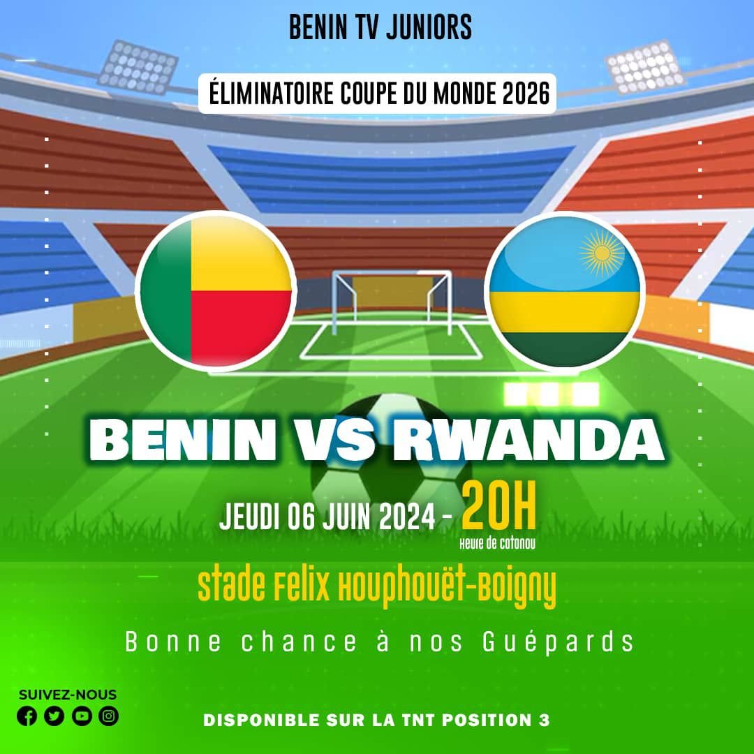 En effet, le coup d’envoi du match Bénin vs Rwanda sera donné à 20h heure locale (21h au Rwanda). Selon les infos fiables, les supporters pourront suivre cette rencontre en direct sur la plateforme FIFA+. Il suffit de télécharger gratuitement FIFA+ sur Play Store ou Apple Store et se connecter ce jeudi 06 juin 2024 à partir 19h48 pour suivre l’intégralité de cette rencontre. Au Rwanda, des sources locales indiquent que le match Bénin vs Rwanda sera en direct sur RWANDA TV (Canal 380 sur le Bouquet CANAL+). Ainsi, si la chaîne n’est pas cryptée à l’heure du match, vous pourriez suivre en direct ! Au Bénin, Bénin TV Juniors est aussi annoncé pour la diffusion en direct du match Bénin vs Rwanda ce jeudi à 20h.