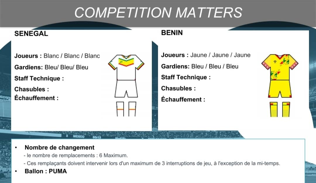 Le Bénin évoluera dans son maillot jaune distinctif, tandis que le Sénégal arborera ses couleurs blanches.