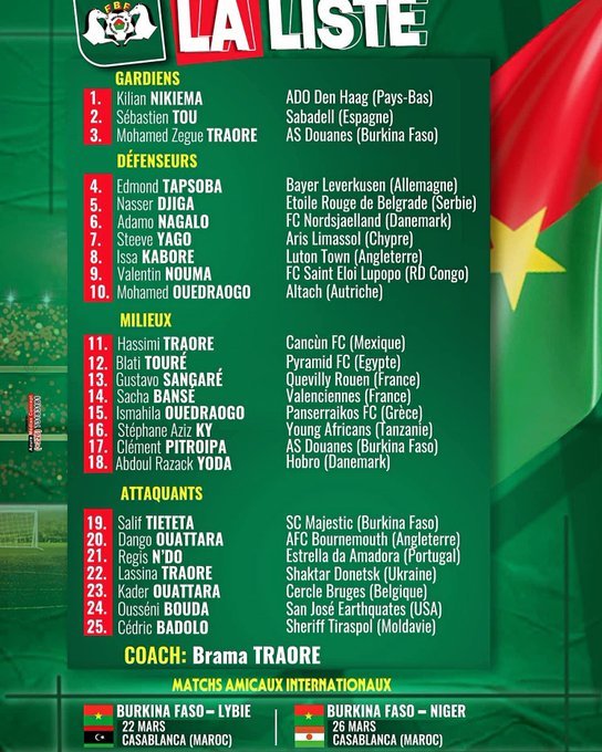 Les Etalons vont affronter la Libye le 22 mars 2024, suivi du Niger le 26 mars 2024. Pour ces rencontres, le technicien burkinabé a choisi de se passer de joueurs clés tels que Bertrand Traoré, Issoufou Dayo, Hervé Koffi et Mohamed Konaté.