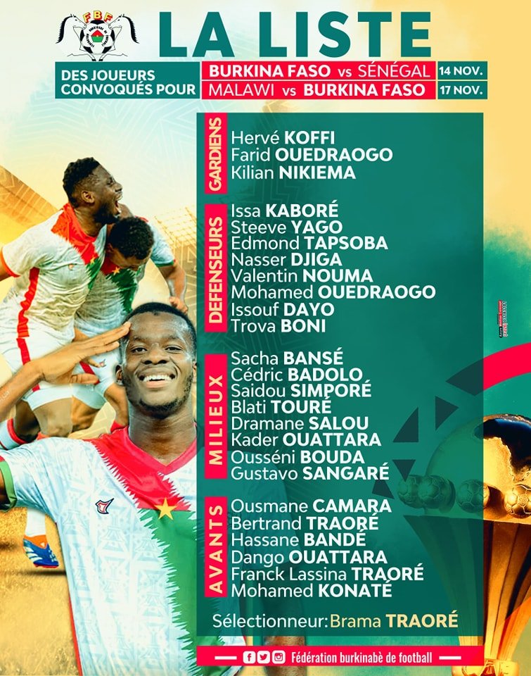 Le sélectionneur burkinabé Brama Traoré a révélé, ce lundi 4 novembre 2024, la liste des 25 joueurs retenus pour les rencontres des 5ᵉ et 6ᵉ journées des éliminatoires de la CAN Maroc 2025. Les Étalons, déjà qualifiés pour le tournoi continental, affronteront le Sénégal le 14 novembre 2024 au Stade du 26-Mars de Bamako, avant de se déplacer à Lilongwe pour jouer contre le Malawi le 17 novembre 2024. L’enjeu pour le Burkina Faso est désormais de décrocher la première place de son groupe, une position disputée avec le Sénégal, également qualifié pour la phase finale de la CAN.