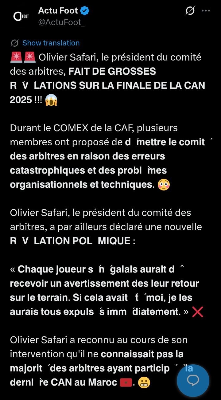 Mais c’est surtout une déclaration d’Olivier Safari qui a fait l’effet d’une bombe. Des propos relayés par Actu Foot sur X lui sont attribués : « Chaque joueur sénégalais aurait dû recevoir un avertissement dès leur retour sur le terrain. Si cela avait été moi, je les aurais tous expulsés immédiatement. »