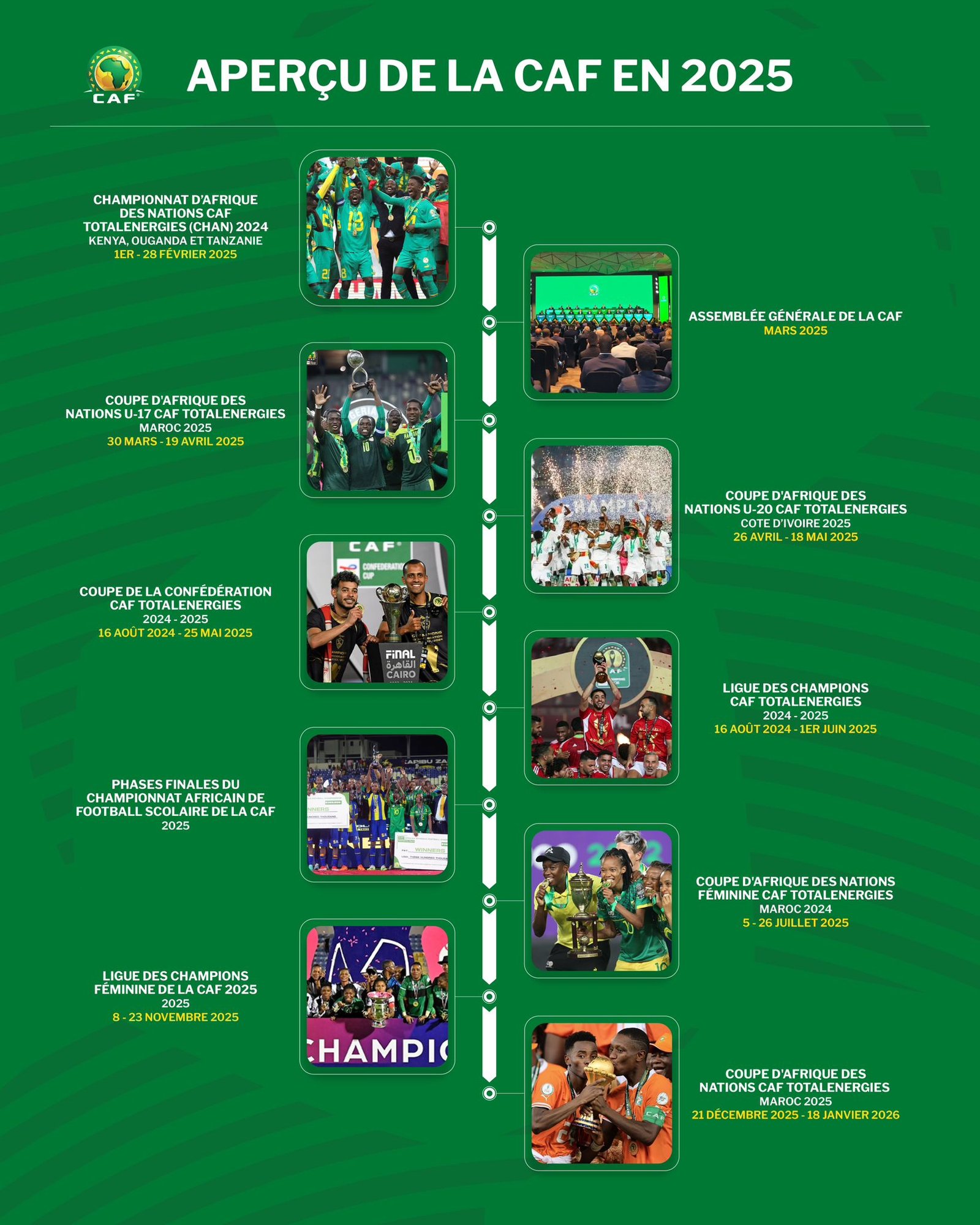 Entre compétitions de jeunes, championnats interclubs et tournois majeurs, l’année 2025 s’annonce exceptionnelle pour le football africain. La CAF continue de promouvoir toutes les catégories du football, renforçant ainsi la compétitivité sur le continent et offrant une plateforme aux talents émergents.