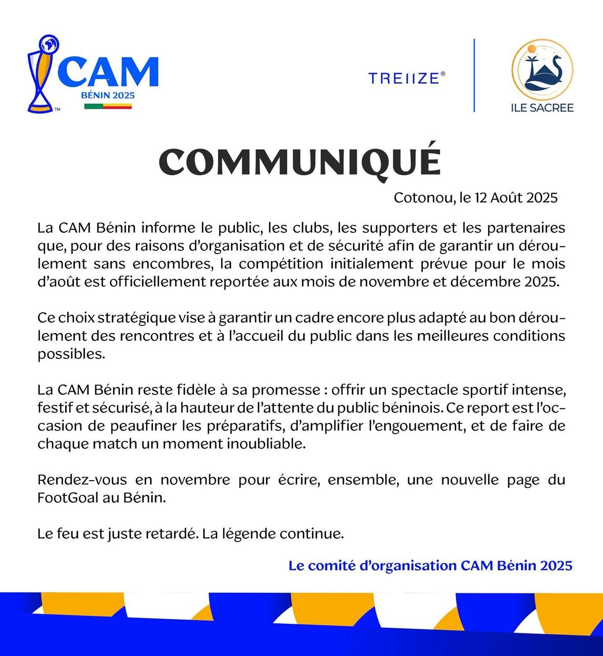 La compétition de la CAM Bénin 2025, initialement programmée pour le mois d’août 2025, est officiellement reportée. L’annonce a été faite ce mardi 12 août 2025 par les organisateurs. Le tournoi a été ramené à la période novembre – décembre 2025. Cette décision intervient en raison des travaux routiers en cours devant le Hall des Arts, lieu prévu pour accueillir la compétition.