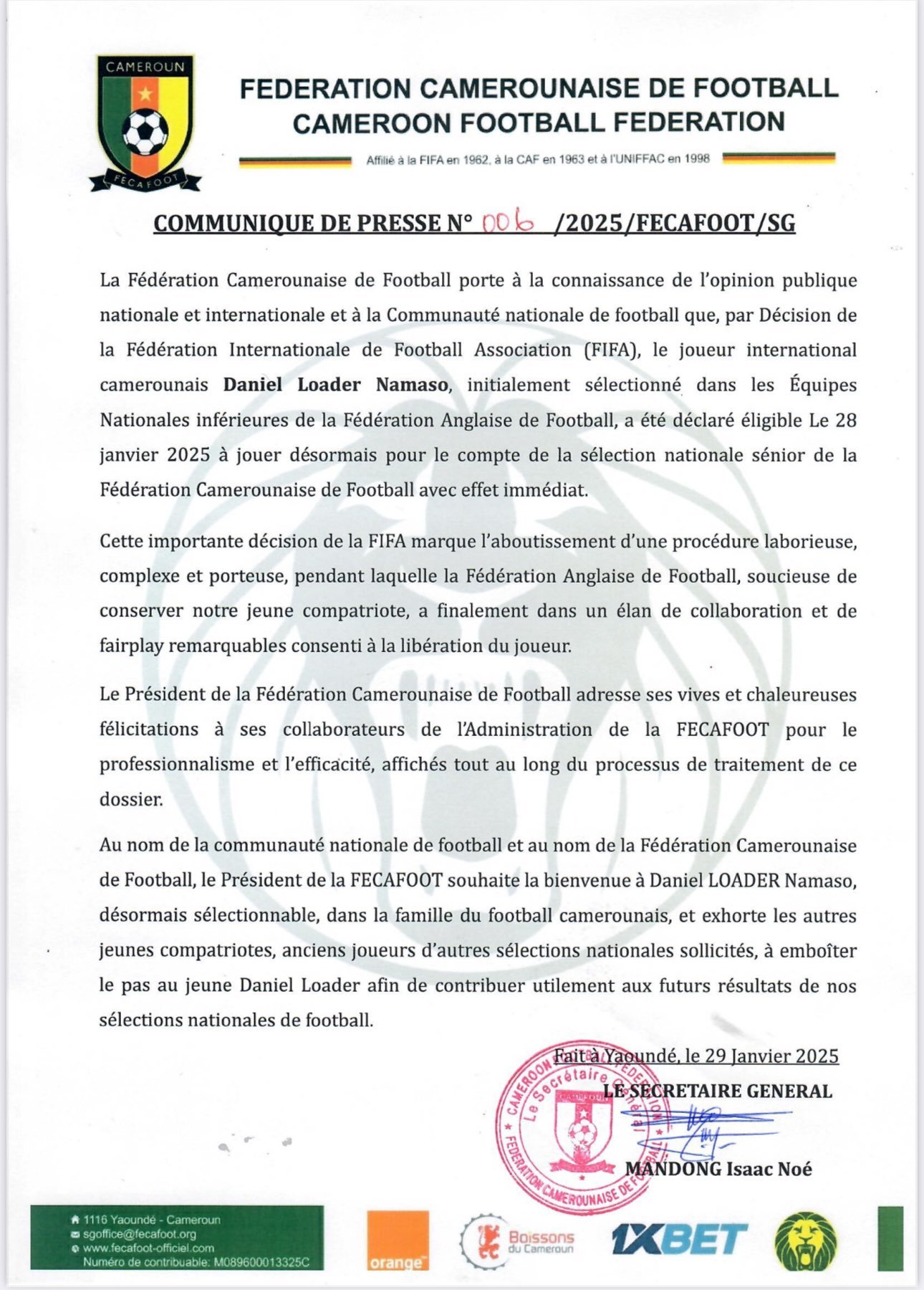 Dans un communiqué publié dans la nuit du mercredi 29 janvier 2025, la Fecafoot a confirmé que la FIFA a validé le changement de nationalité sportive de l’attaquant de 24 ans. “La Fédération Camerounaise de Football porte à la connaissance de l’opinion publique nationale et internationale et à la Communauté nationale de football que, par décision de la FIFA, le joueur international camerounais Daniel Loader Namaso, initialement sélectionné dans les équipes nationales inférieures de la Fédération Anglaise de Football, a été déclaré éligible le 28 janvier 2025 à jouer désormais pour le compte de la sélection nationale sénior de la Fédération Camerounaise de Football avec effet immédiat.”