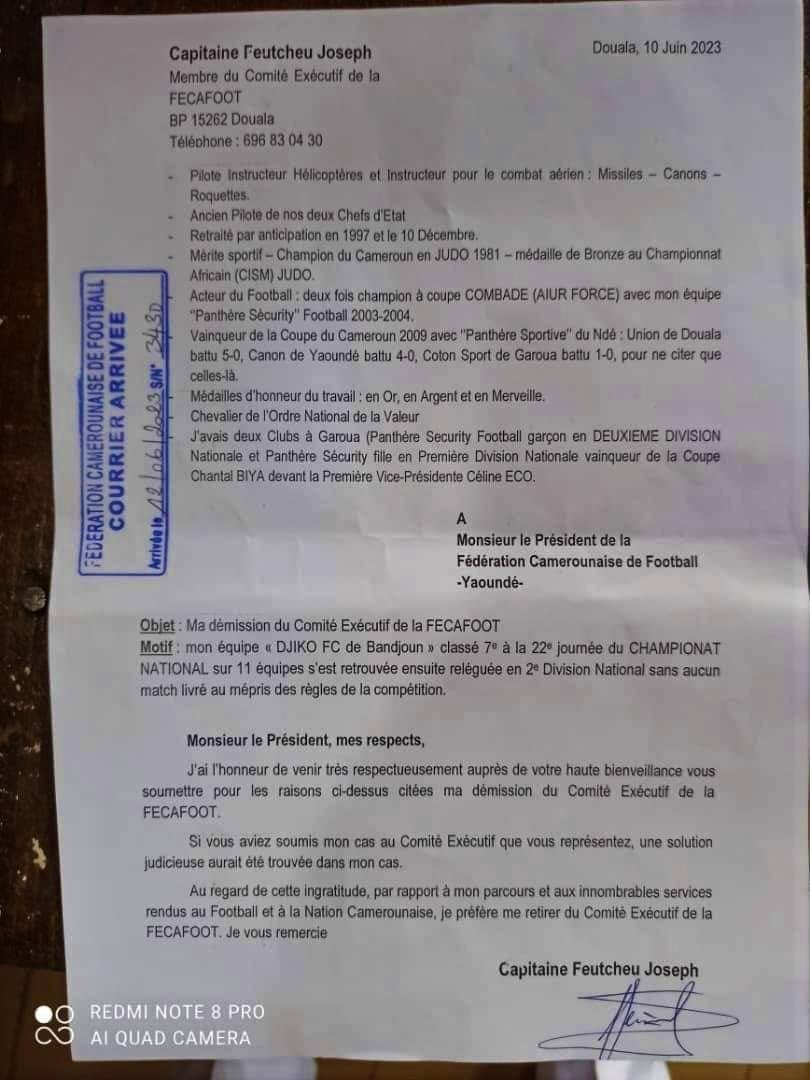 Joseph Feutcheu a expliqué les motivations de sa démission du Comex de la FECAFOOT dans une lettre adressée au président de l’instance, Samuel Eto’o. Il met en avant le classement honorable de son équipe, qui était à la 7e place à la 22e journée du championnat national, mais qui s’est retrouvée reléguée en Elite 2 sans avoir disputé aucun match. Il estime que cette relégation est injuste et qu’elle enfreint les règles de la compétition. Cette situation a conduit Joseph Feutcheu à prendre la décision de quitter le Comex, exprimant ainsi son mécontentement face à cette situation inacceptable.
