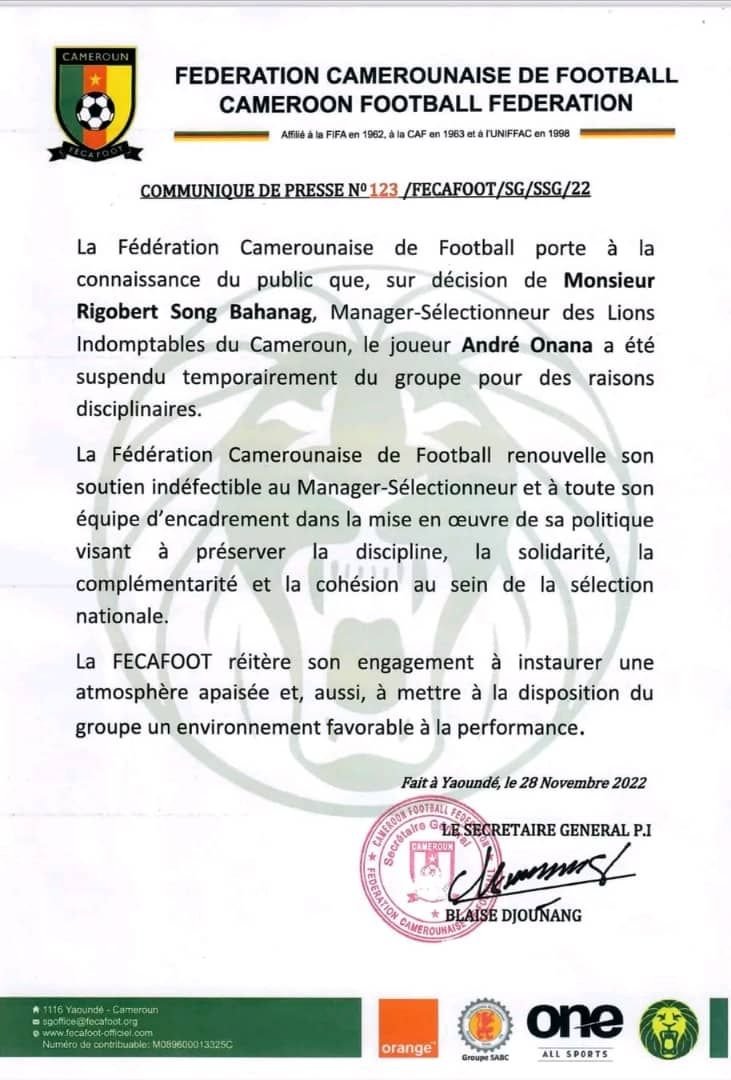 Ci joint le communiqué de la Fédération Camerounaise de Football