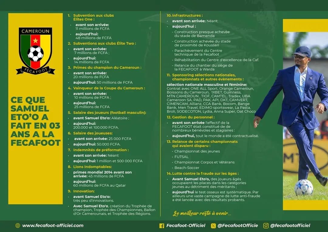 Depuis son élection en 2021, Samuel Eto’o a initié plusieurs réformes pour moderniser le football camerounais. Ces mesures comprennent :