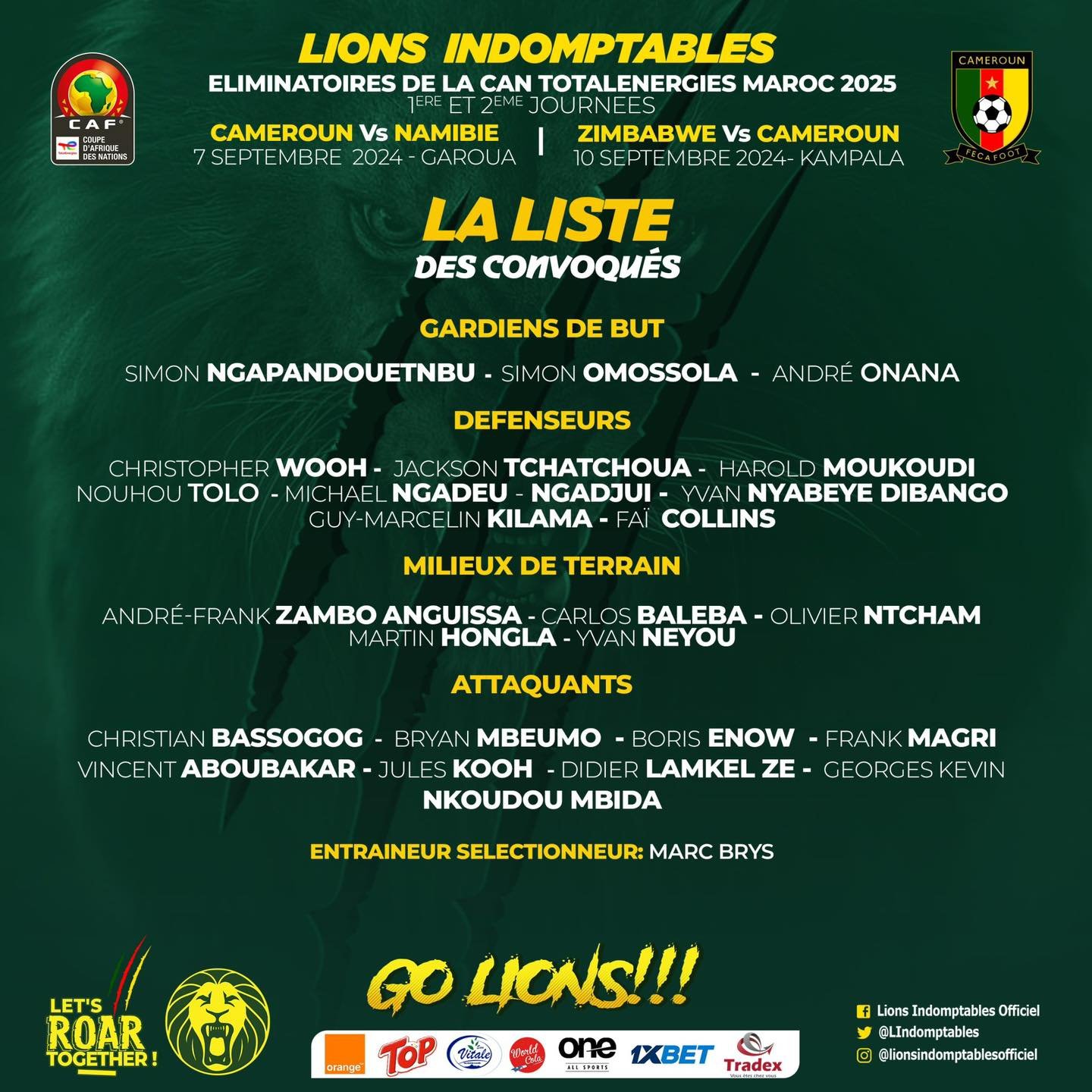 Ce vendredi 30 août 2024, Marc Bry, a dévoilé la liste des joueurs retenus pour les premières journées des éliminatoires de la CAN 2025. La FECAFOOT a communiqué les noms des joueurs qui représenteront les Lions Indomptables lors des deux premiers matchs, à travers une publication sur ses réseaux.