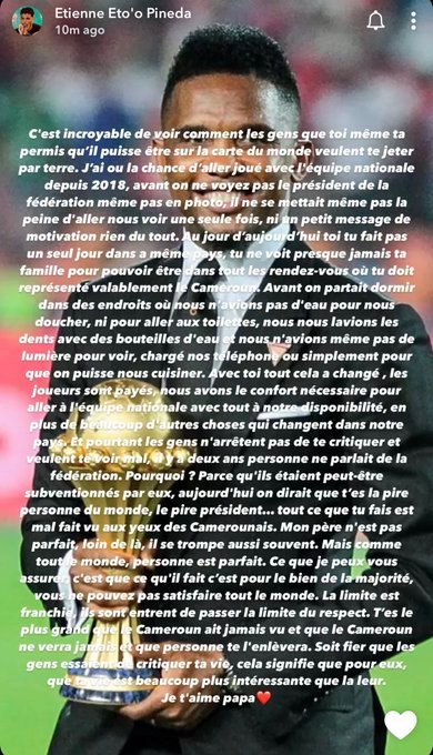“Et pourtant les gens n’arrêtent pas de te critiquer. Il y a deux ans, personne ne parlait de la fédération. Pourquoi ? Parce qu’ils étaient peut-être subventionnés par eux. Aujourd’hui, on dirait que t’es la pire personne du monde, le pire président. Tout ce que tu fais est mal vu aux yeux des Camerounais. Mon père n’est pas parfait, loin de là, il se trompe aussi souvent. Mais comme tout le monde, personne n’est parfait. Ce que je peux vous assurer c’est que ce qu’il fait c’est pour le bien de la majorité. Vous ne pouvez pas satisfaire tout le monde. La limite est franchie. Ils sont en train de franchir la limite du respect. T’es le plus grand que le Cameroun n’ait jamais vu et que le Cameroun verra et personne ne te l’enlèvera. Soit fier que les gens essayent de critiquer ta vie, cela signifie qu’elle est beaucoup plus intéressante que la leur.”